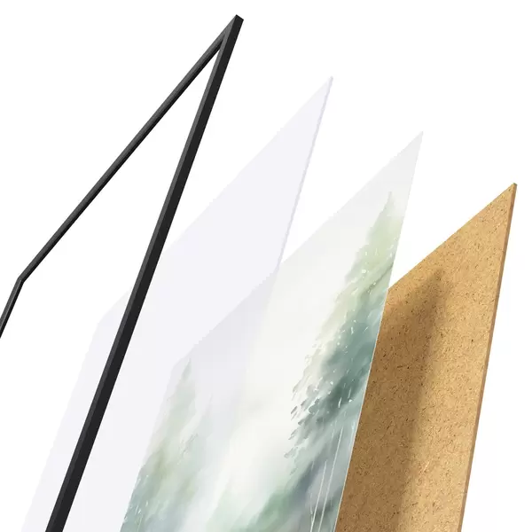 Plagát sa skladá z rámu, plexiskla, vytlačeného obrazu a podkladu z drevotriesky. Plagát možno okamžite zavesiť na stenu vďaka úchytom na zadnej strane.