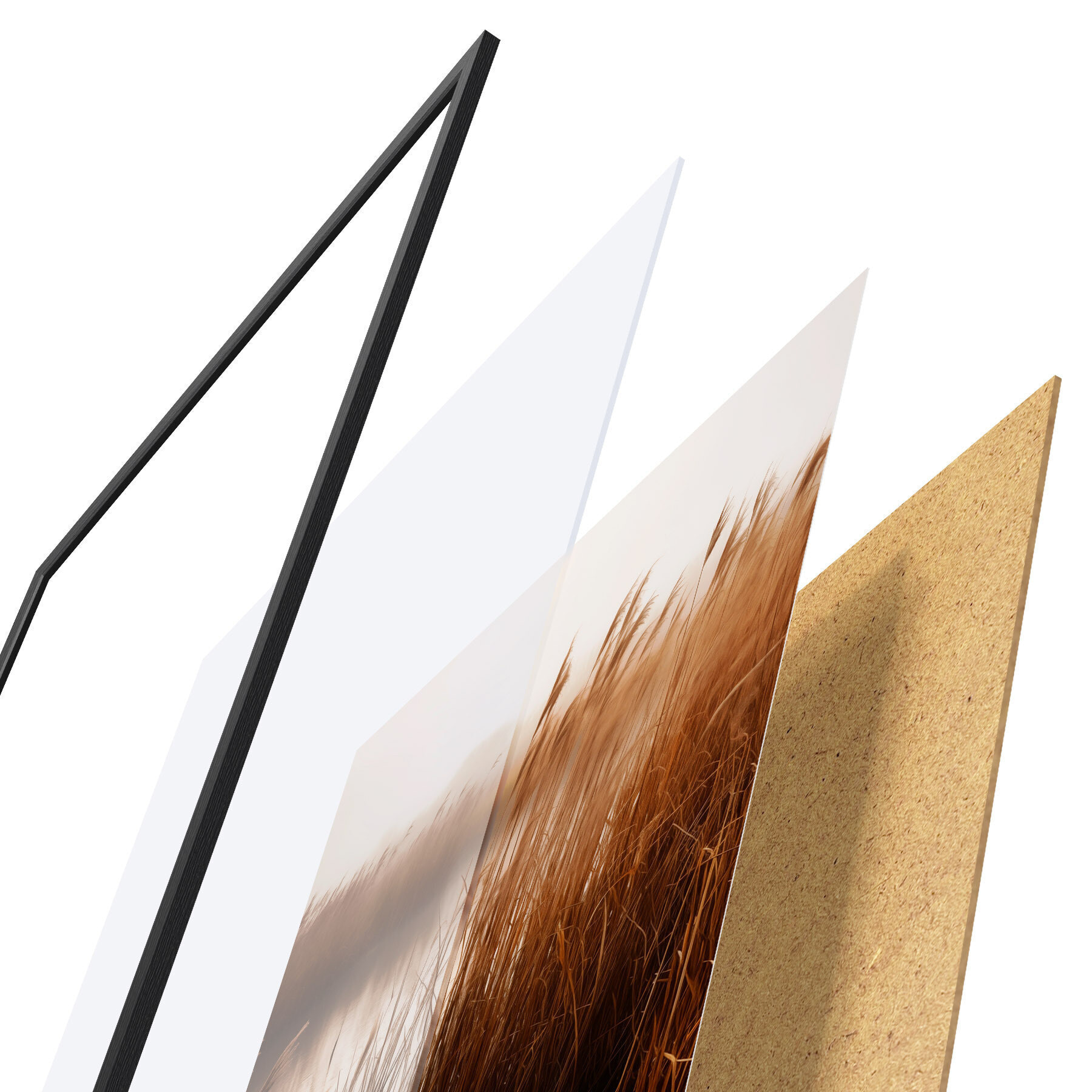 Plagát sa skladá z rámu, plexiskla, vytlačeného obrazu a podkladu z drevotriesky. Plagát možno okamžite zavesiť na stenu vďaka úchytom na zadnej strane.