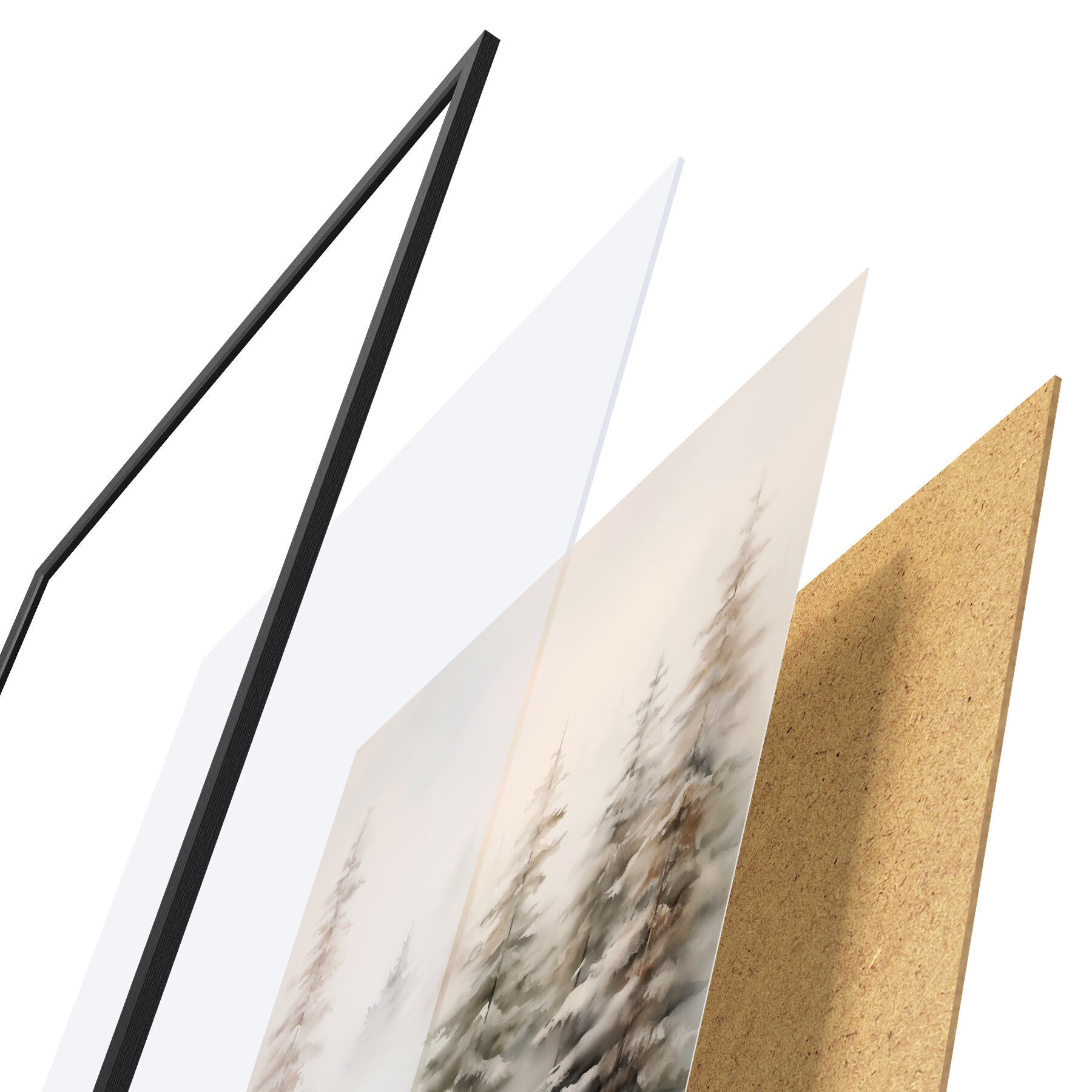 Plagát sa skladá z rámu, plexiskla, vytlačeného obrazu a podkladu z drevotriesky. Plagát možno okamžite zavesiť na stenu vďaka úchytom na zadnej strane.
