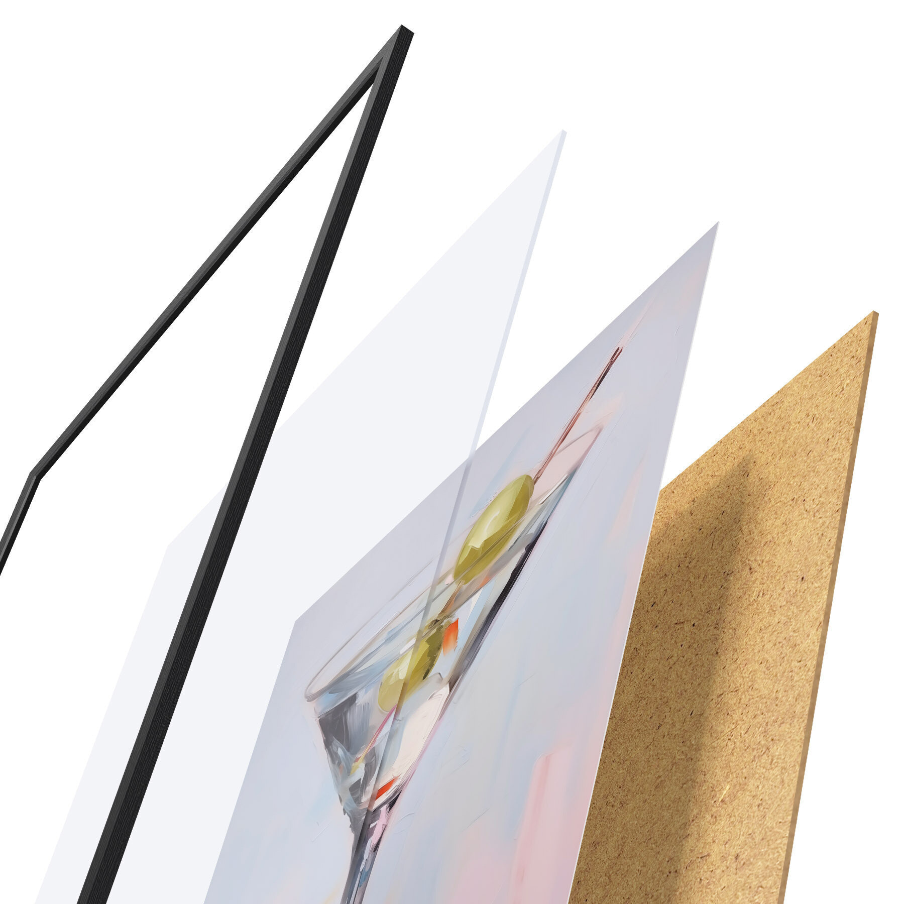 Plagát sa skladá z rámu, plexiskla, vytlačeného obrazu a podkladu z drevotriesky. Plagát možno okamžite zavesiť na stenu vďaka úchytom na zadnej strane.