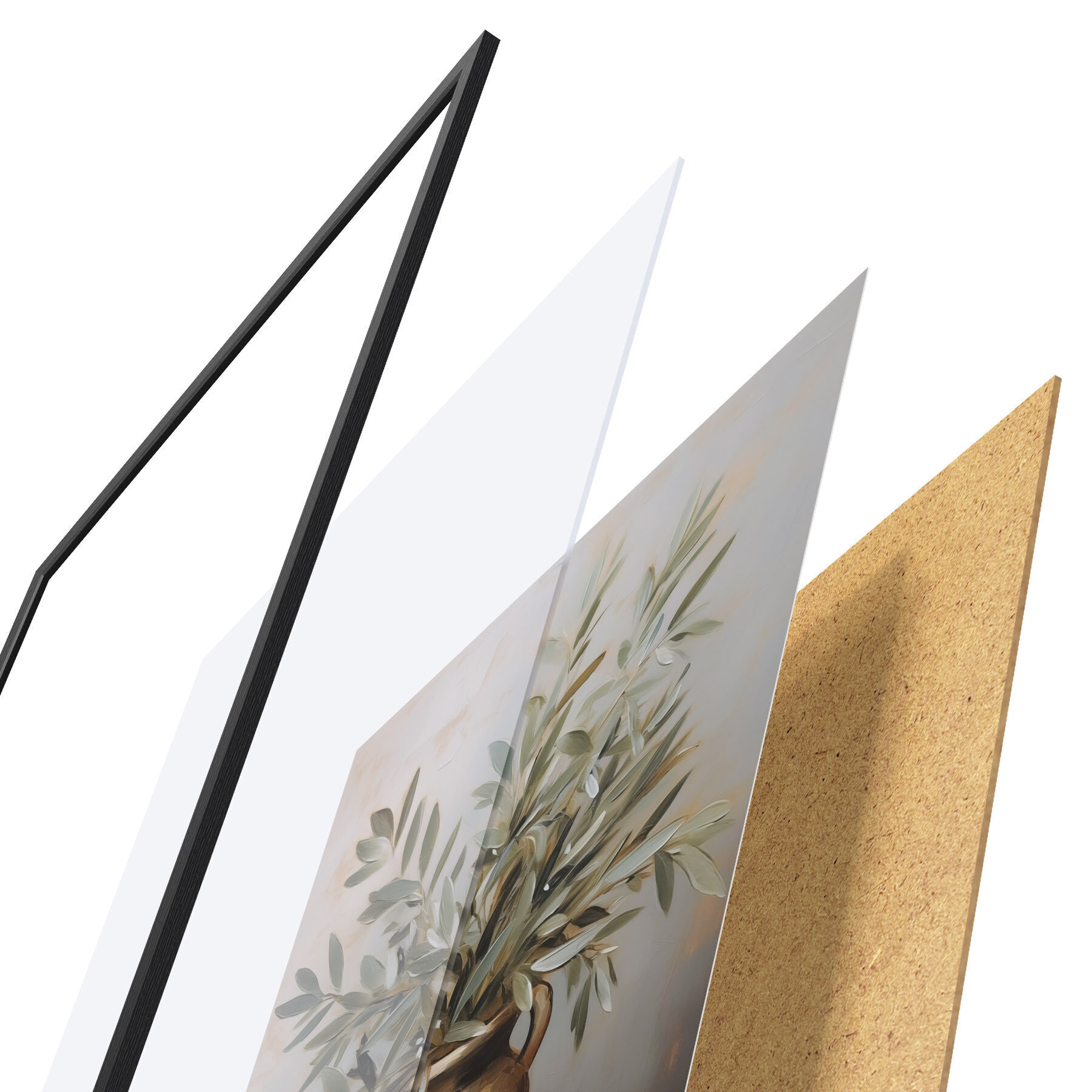 Plagát sa skladá z rámu, plexiskla, vytlačeného obrazu a podkladu z drevotriesky. Plagát možno okamžite zavesiť na stenu vďaka úchytom na zadnej strane.