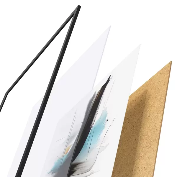 Plagát sa skladá z rámu, plexiskla, vytlačeného obrazu a podkladu z drevotriesky. Plagát možno okamžite zavesiť na stenu vďaka úchytom na zadnej strane.