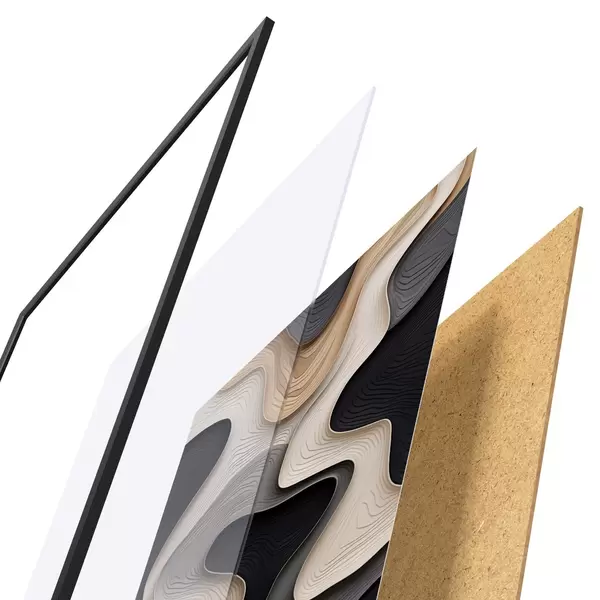 Plagát sa skladá z rámu, plexiskla, vytlačeného obrazu a podkladu z drevotriesky. Plagát možno okamžite zavesiť na stenu vďaka úchytom na zadnej strane.