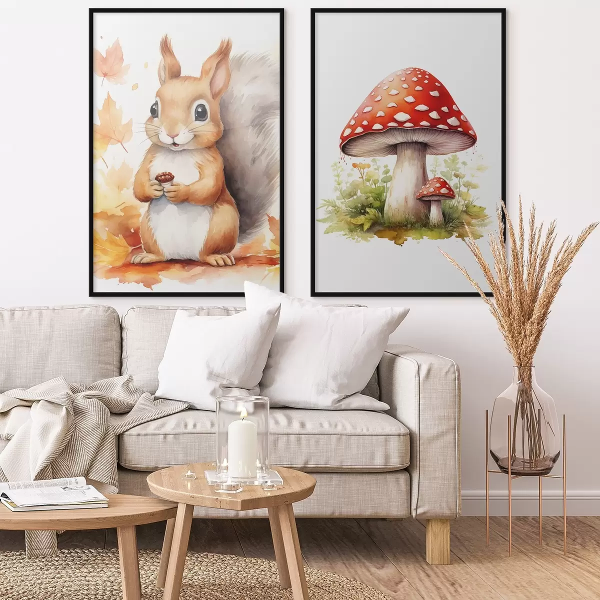 Plagáty Veverička a lesná huba, muchotrávka, imitácia akvarelu Nr d01049