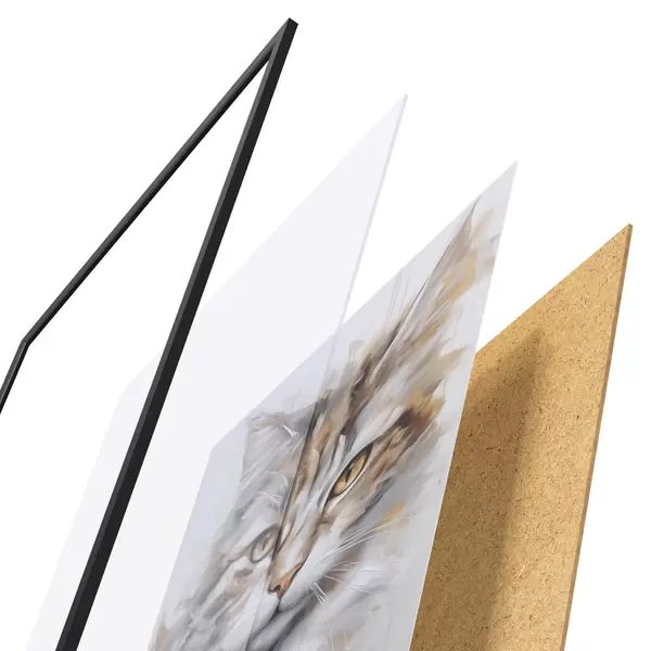 Plagát sa skladá z rámu, plexiskla, vytlačeného obrazu a podkladu z drevotriesky. Plagát možno okamžite zavesiť na stenu vďaka úchytom na zadnej strane.