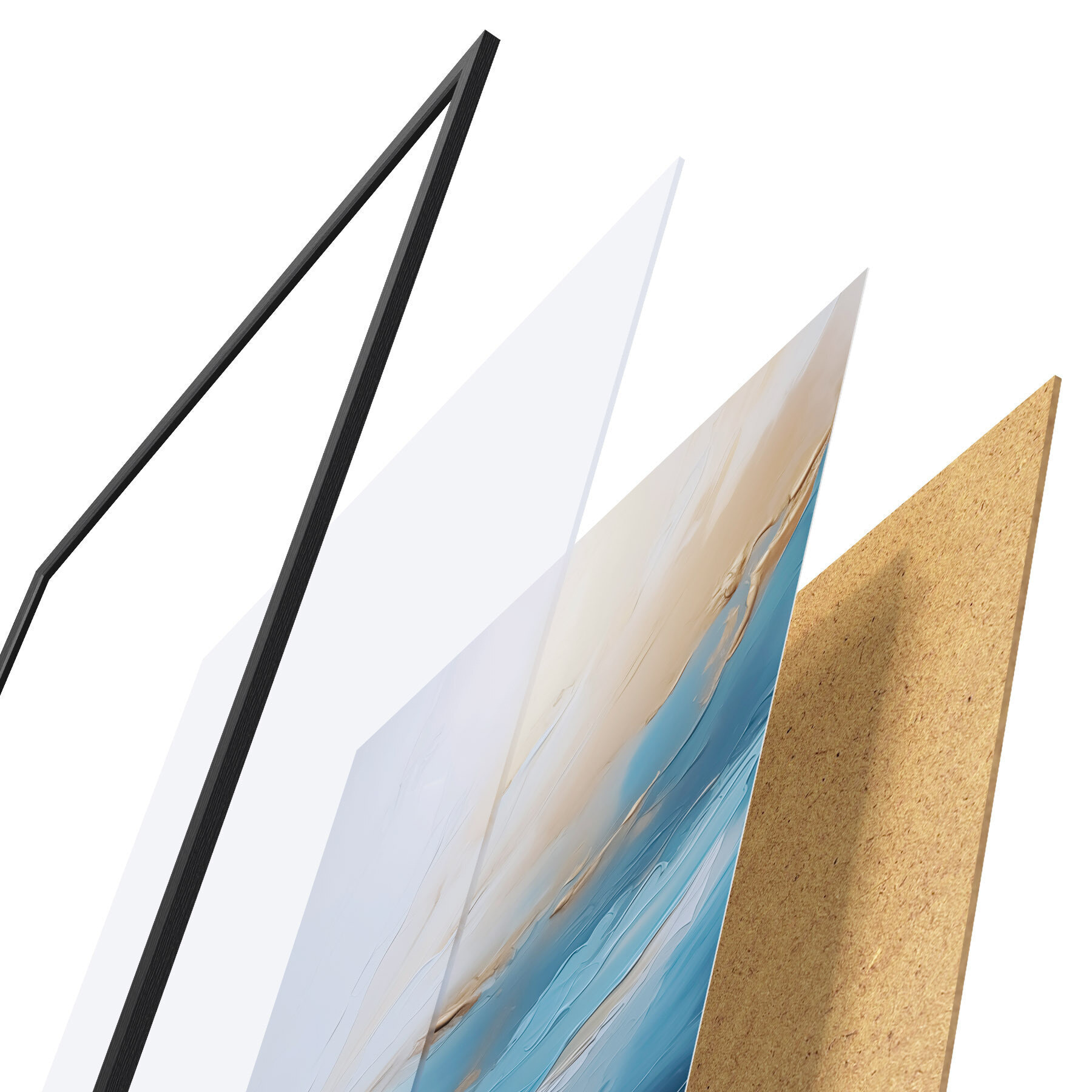 Plagát sa skladá z rámu, plexiskla, vytlačeného obrazu a podkladu z drevotriesky. Plagát možno okamžite zavesiť na stenu vďaka úchytom na zadnej strane.