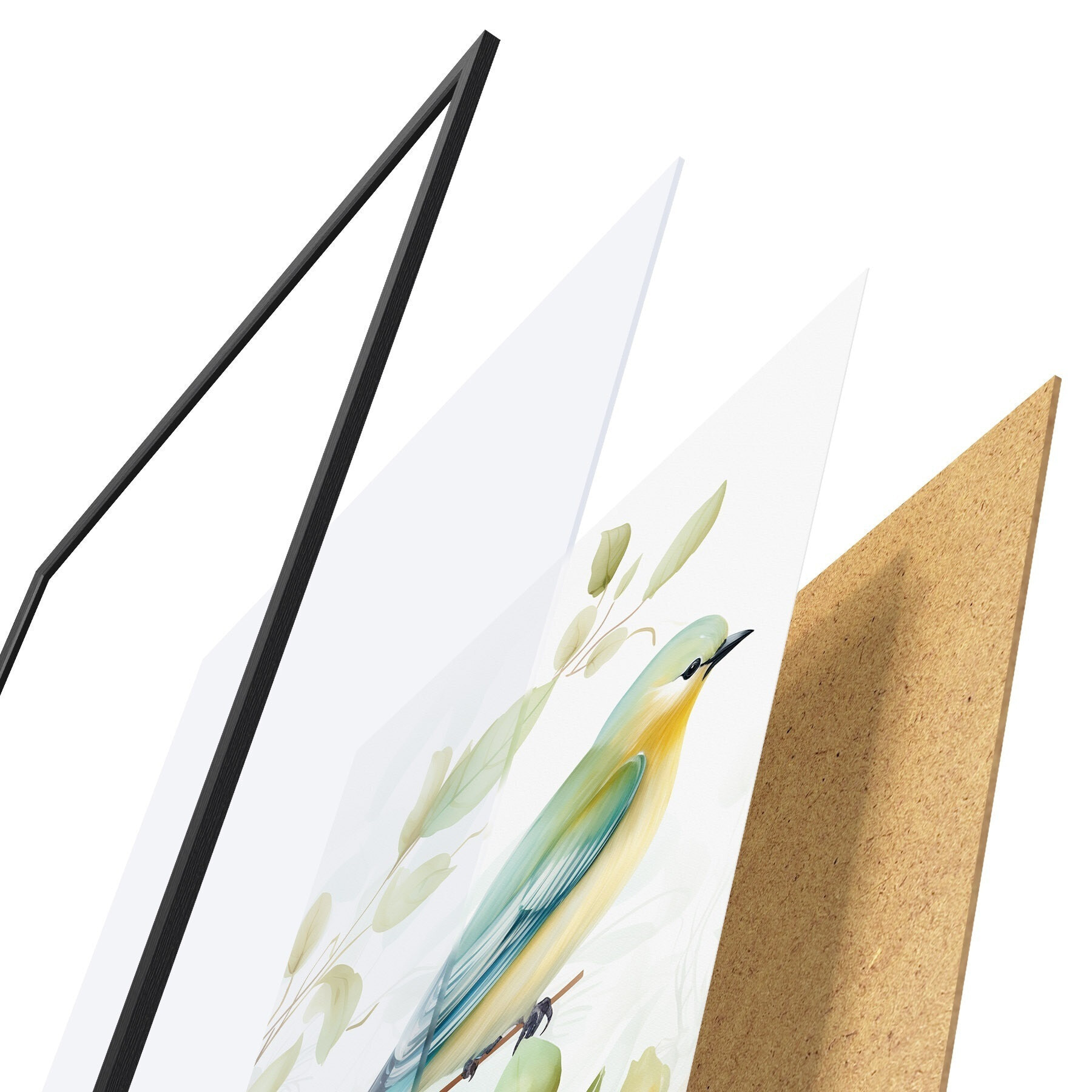 Plagát sa skladá z rámu, plexiskla, vytlačeného obrazu a podkladu z drevotriesky. Plagát možno okamžite zavesiť na stenu vďaka úchytom na zadnej strane.