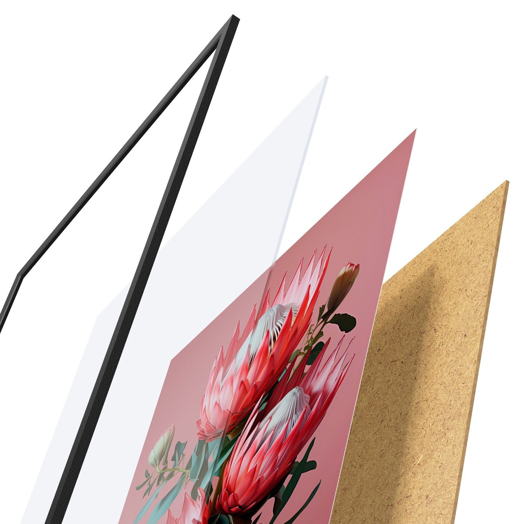 Plagát sa skladá z rámu, plexiskla, vytlačeného obrazu a podkladu z drevotriesky. Plagát možno okamžite zavesiť na stenu vďaka úchytom na zadnej strane.