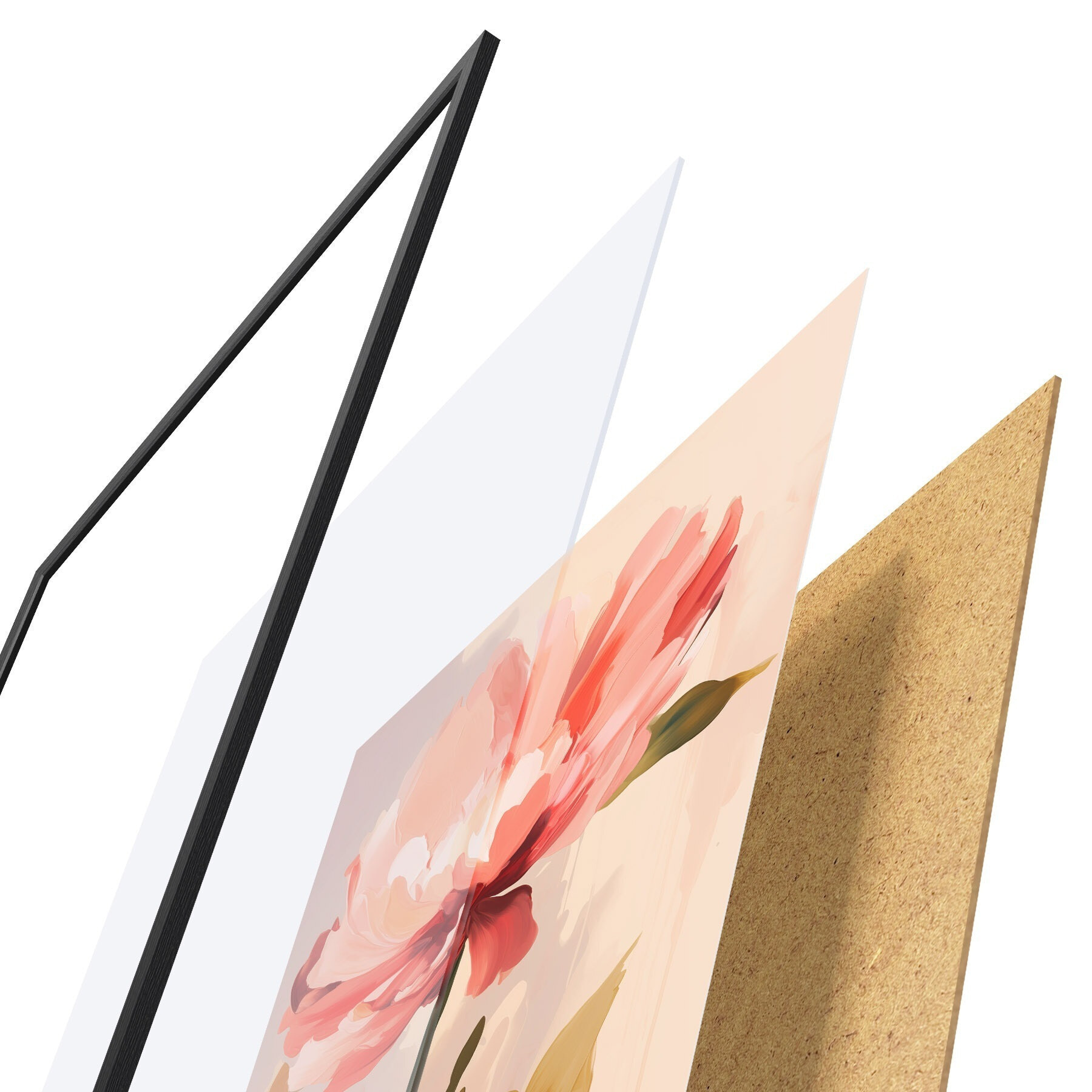 Plagát sa skladá z rámu, plexiskla, vytlačeného obrazu a podkladu z drevotriesky. Plagát možno okamžite zavesiť na stenu vďaka úchytom na zadnej strane.