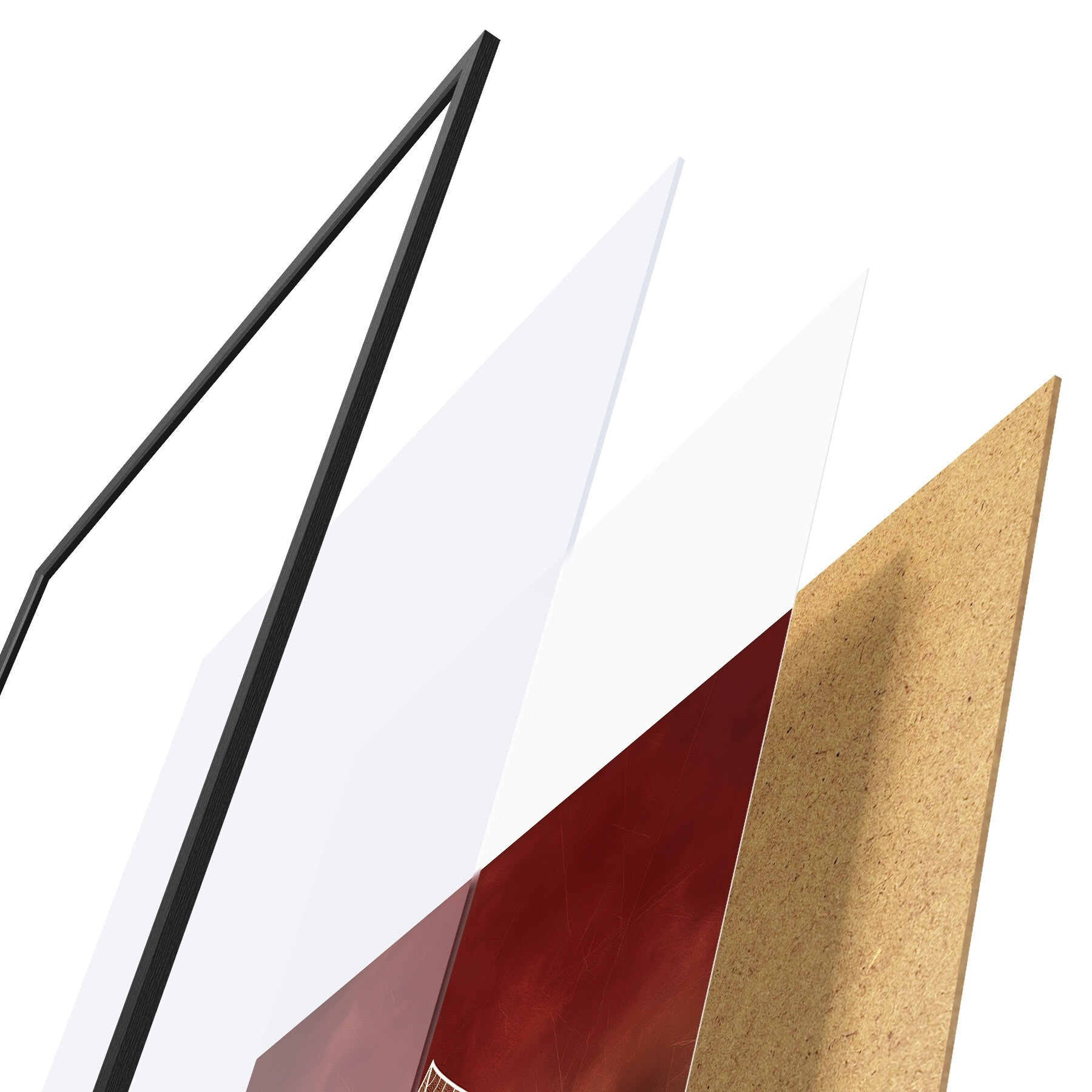 Plagát sa skladá z rámu, plexiskla, vytlačeného obrazu a podkladu z drevotriesky. Plagát možno okamžite zavesiť na stenu vďaka úchytom na zadnej strane.