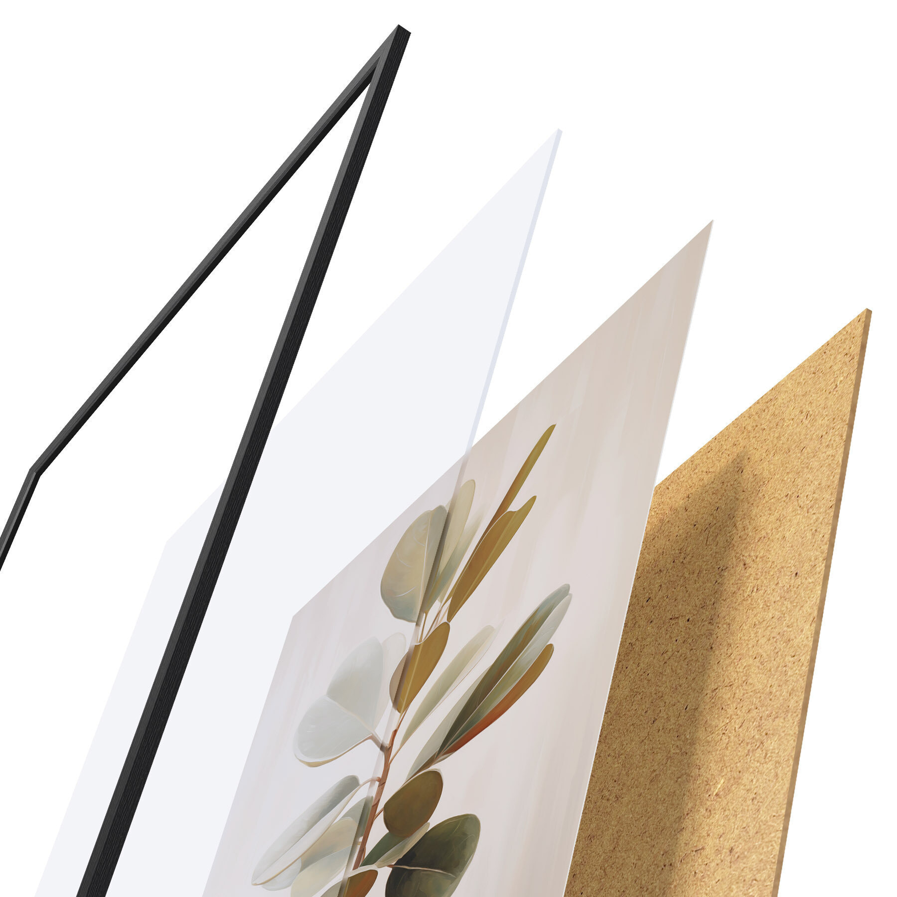 Plagát sa skladá z rámu, plexiskla, vytlačeného obrazu a podkladu z drevotriesky. Plagát možno okamžite zavesiť na stenu vďaka úchytom na zadnej strane.