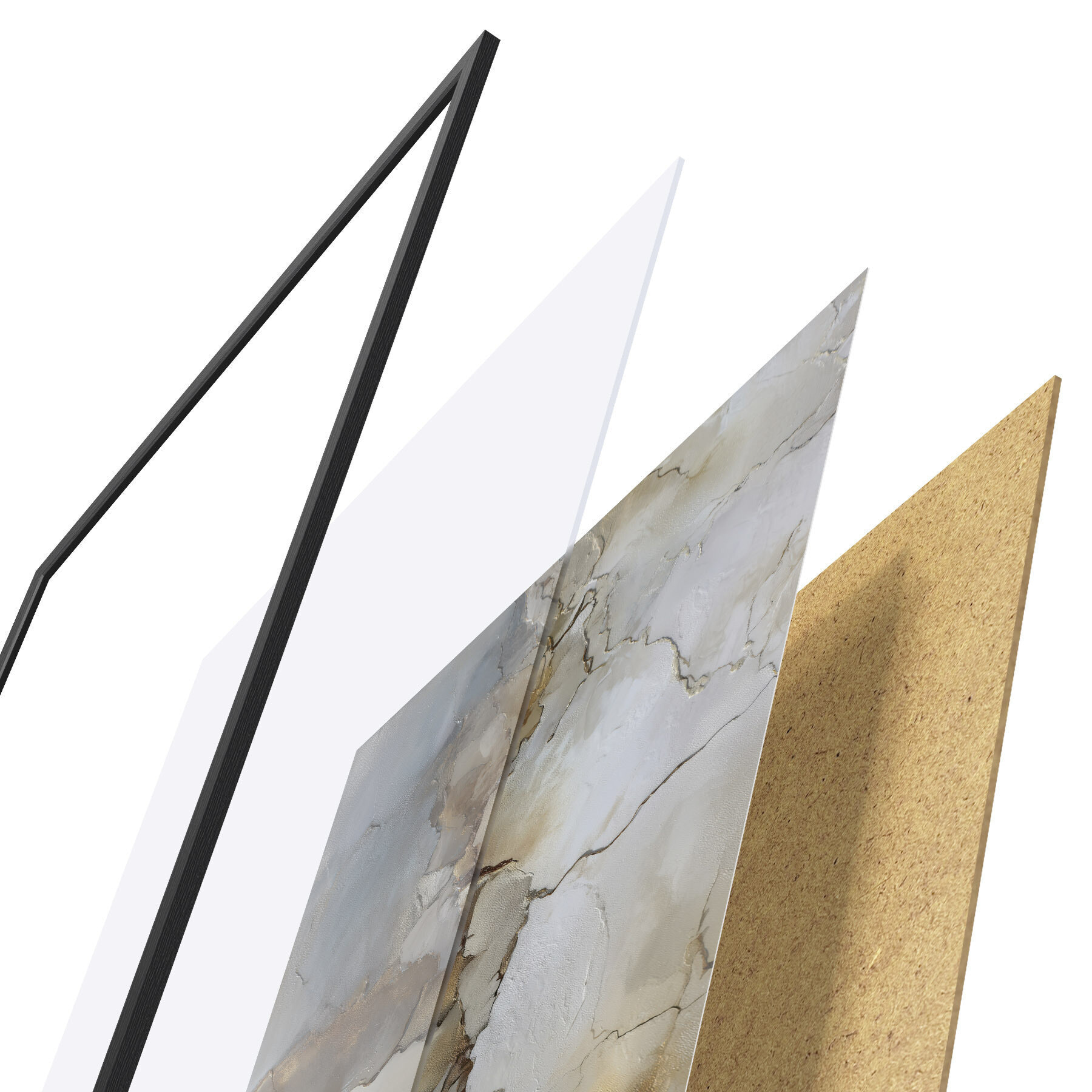 Plagát sa skladá z rámu, plexiskla, vytlačeného obrazu a podkladu z drevotriesky. Plagát možno okamžite zavesiť na stenu vďaka úchytom na zadnej strane.