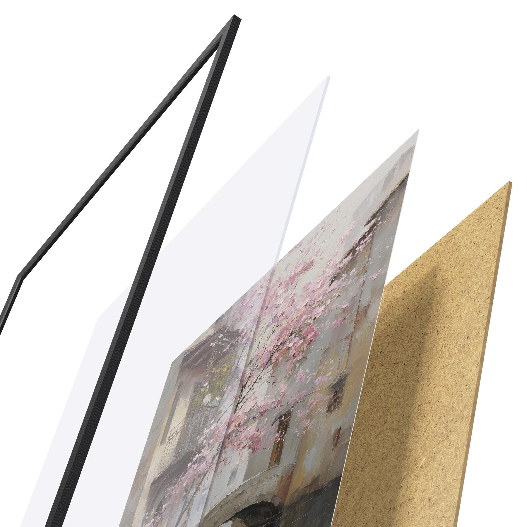 Plagát sa skladá z rámu, plexiskla, vytlačeného obrazu a podkladu z drevotriesky. Plagát možno okamžite zavesiť na stenu vďaka úchytom na zadnej strane.
