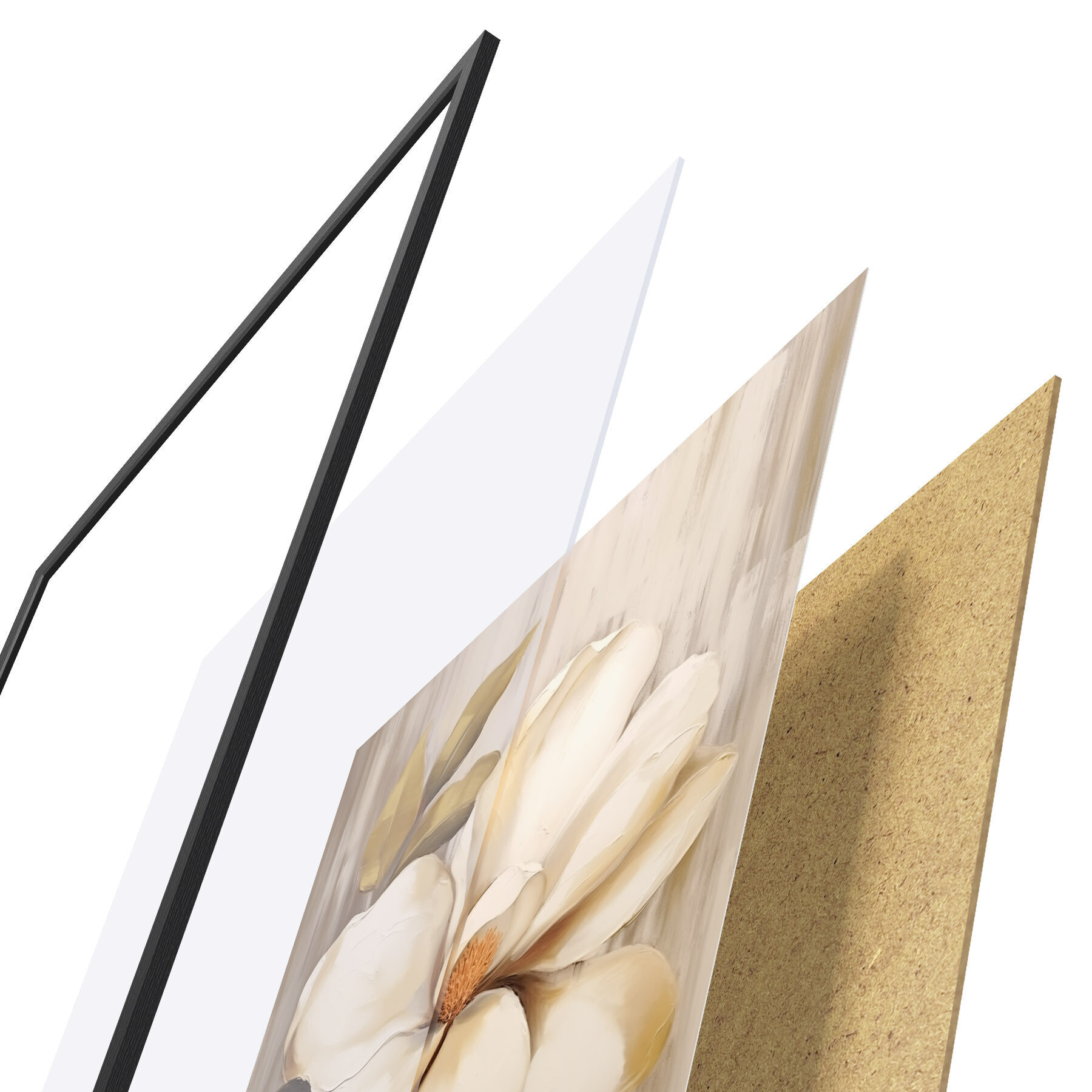 Plagát sa skladá z rámu, plexiskla, vytlačeného obrazu a podkladu z drevotriesky. Plagát možno okamžite zavesiť na stenu vďaka úchytom na zadnej strane.