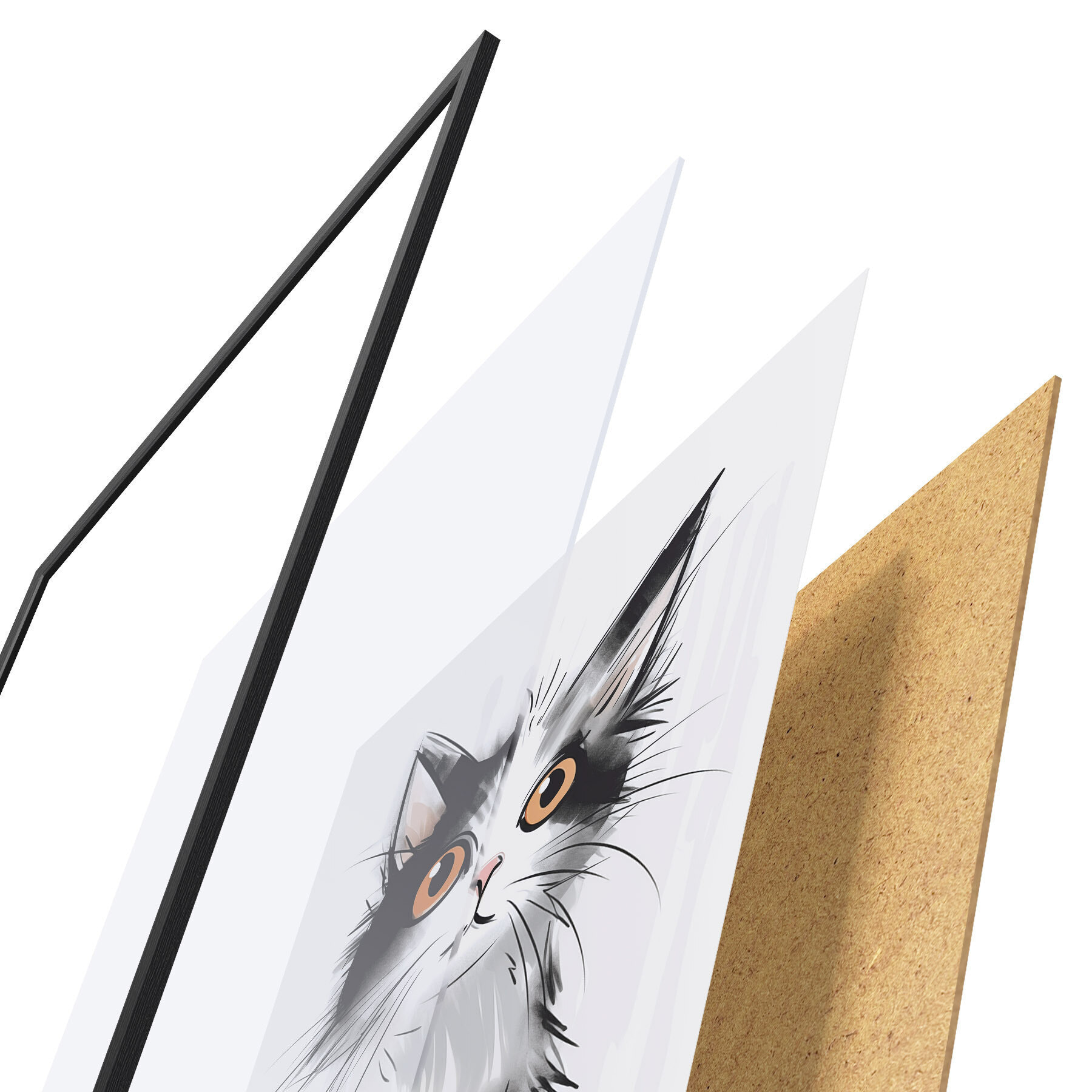 Plagát sa skladá z rámu, plexiskla, vytlačeného obrazu a podkladu z drevotriesky. Plagát možno okamžite zavesiť na stenu vďaka úchytom na zadnej strane.
