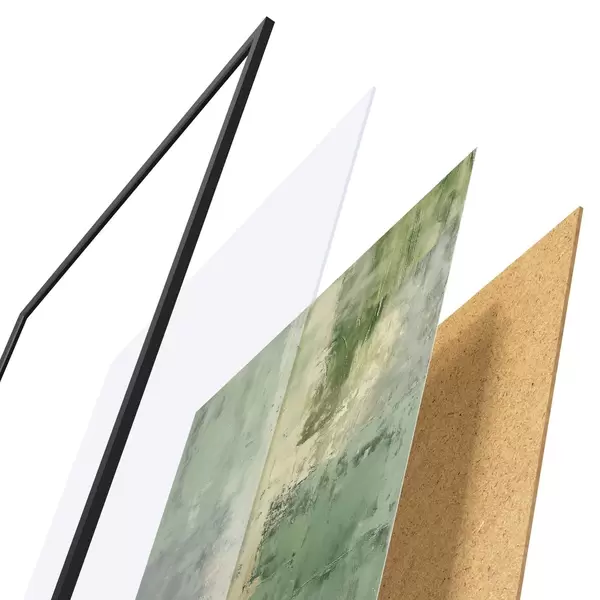 Plagát sa skladá z rámu, plexiskla, vytlačeného obrazu a podkladu z drevotriesky. Plagát možno okamžite zavesiť na stenu vďaka úchytom na zadnej strane.