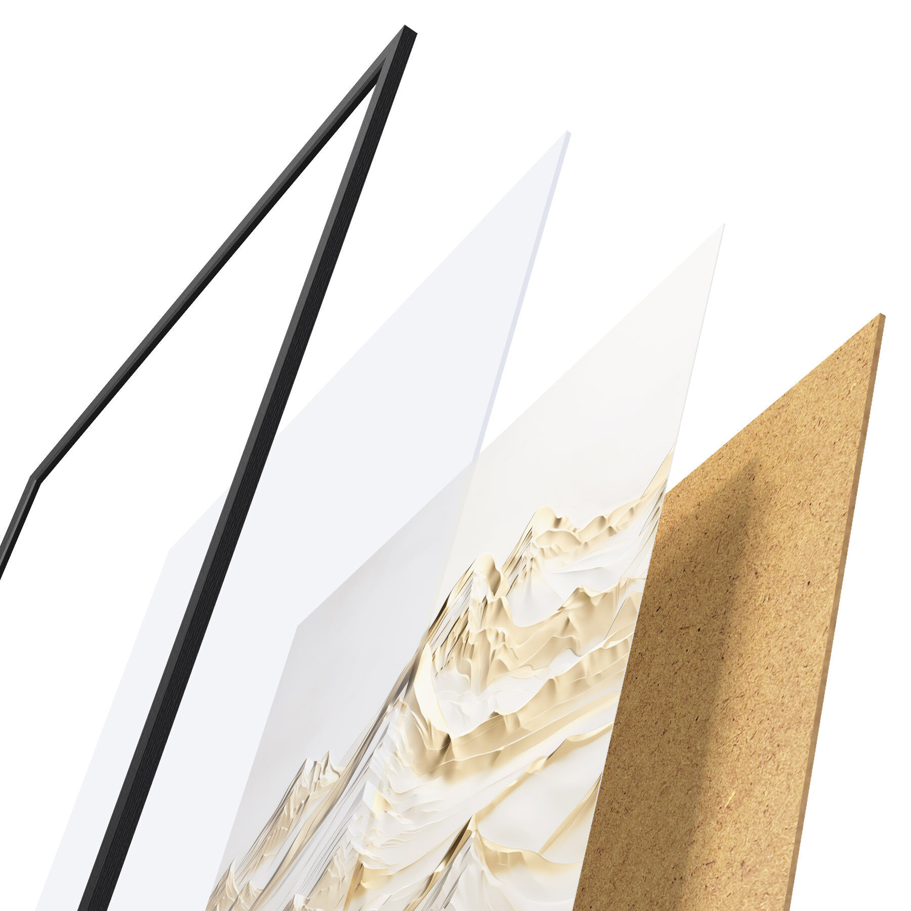 Plagát sa skladá z rámu, plexiskla, vytlačeného obrazu a podkladu z drevotriesky. Plagát možno okamžite zavesiť na stenu vďaka úchytom na zadnej strane.