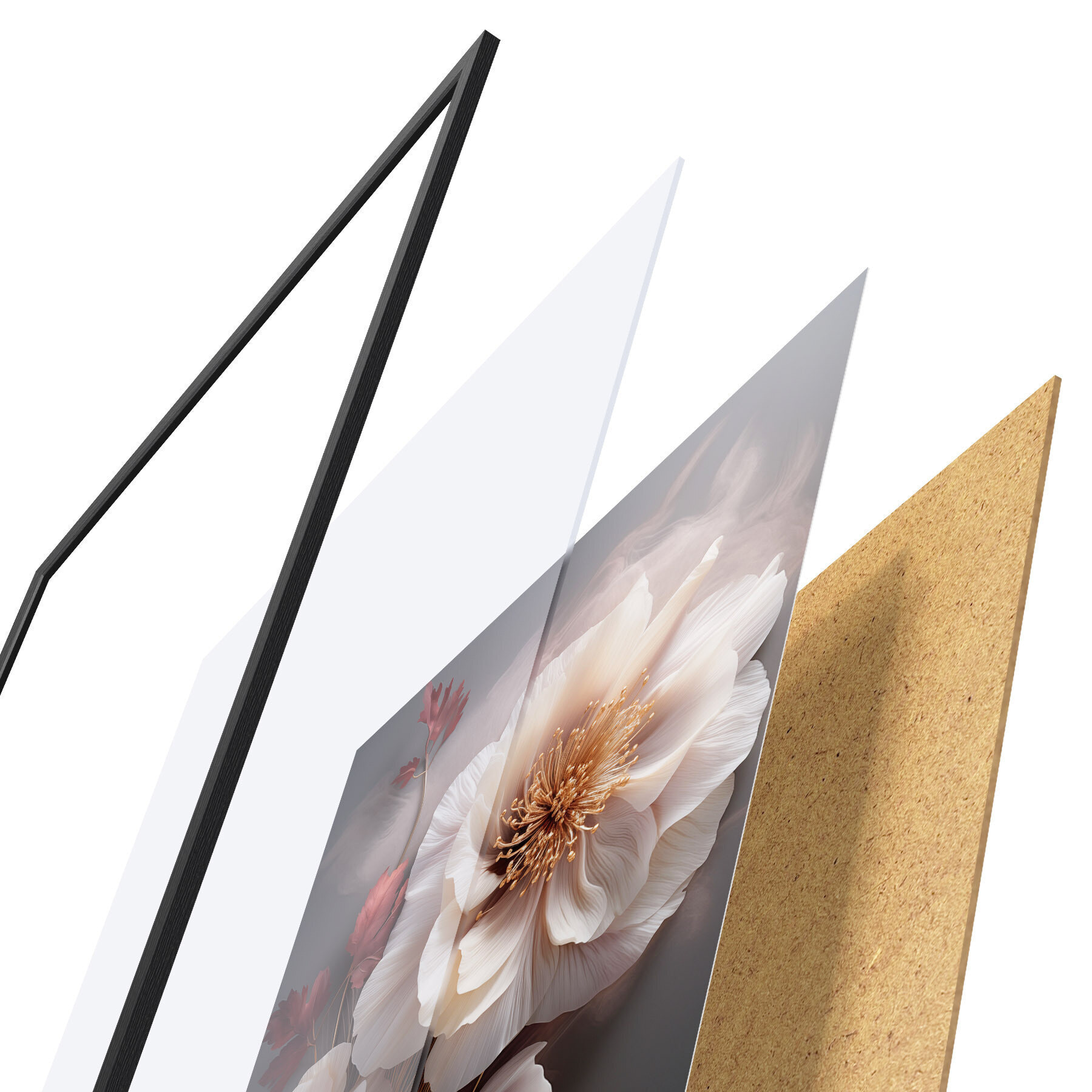 Plagát sa skladá z rámu, plexiskla, vytlačeného obrazu a podkladu z drevotriesky. Plagát možno okamžite zavesiť na stenu vďaka úchytom na zadnej strane.