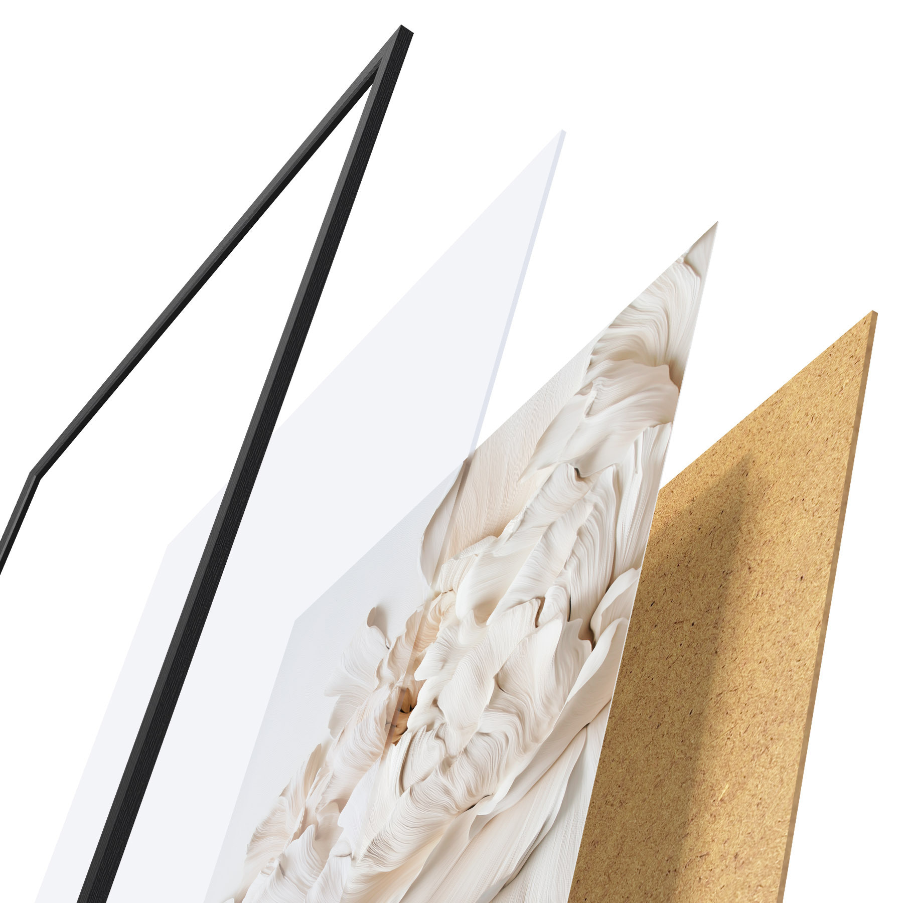 Plagát sa skladá z rámu, plexiskla, vytlačeného obrazu a podkladu z drevotriesky. Plagát možno okamžite zavesiť na stenu vďaka úchytom na zadnej strane.