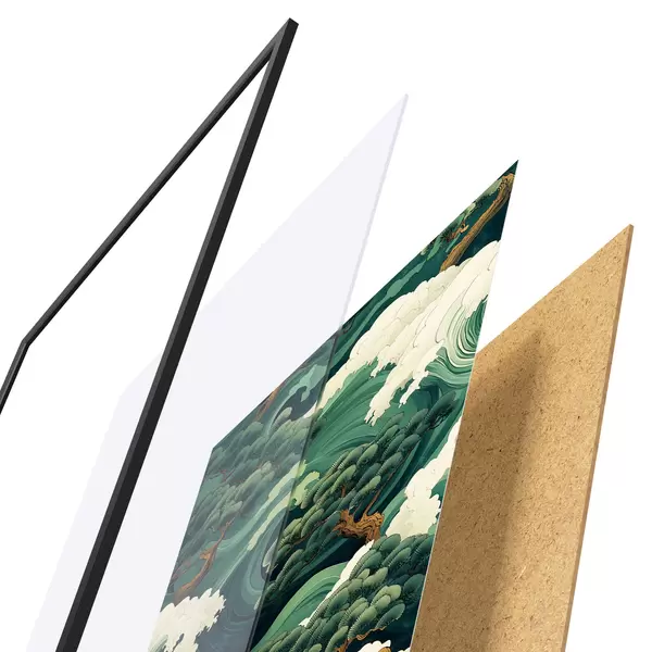 Plagát sa skladá z rámu, plexiskla, vytlačeného obrazu a podkladu z drevotriesky. Plagát možno okamžite zavesiť na stenu vďaka úchytom na zadnej strane.