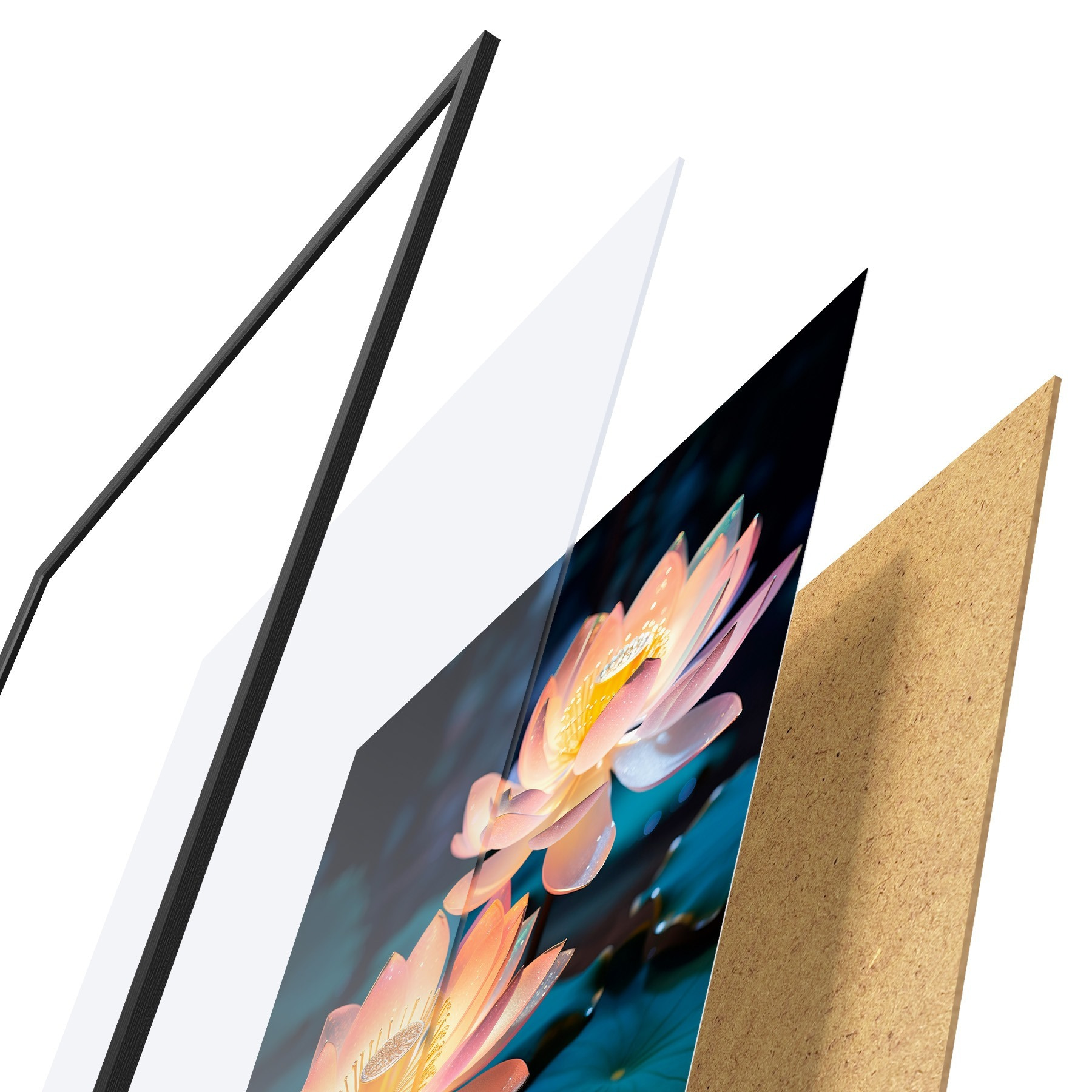 Plagát sa skladá z rámu, plexiskla, vytlačeného obrazu a podkladu z drevotriesky. Plagát možno okamžite zavesiť na stenu vďaka úchytom na zadnej strane.
