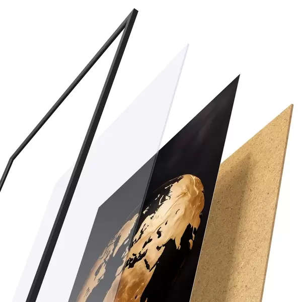 Plagát sa skladá z rámu, plexiskla, vytlačeného obrazu a podkladu z drevotriesky. Plagát možno okamžite zavesiť na stenu vďaka úchytom na zadnej strane.