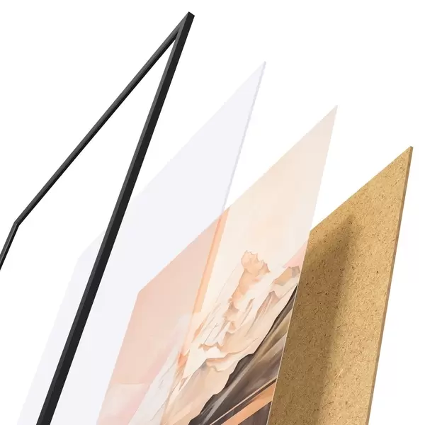 Plagát sa skladá z rámu, plexiskla, vytlačeného obrazu a podkladu z drevotriesky. Plagát možno okamžite zavesiť na stenu vďaka úchytom na zadnej strane.