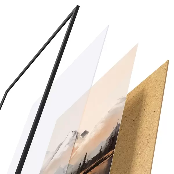Plagát sa skladá z rámu, plexiskla, vytlačeného obrazu a podkladu z drevotriesky. Plagát možno okamžite zavesiť na stenu vďaka úchytom na zadnej strane.