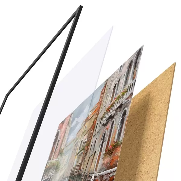 Plagát sa skladá z rámu, plexiskla, vytlačeného obrazu a podkladu z drevotriesky. Plagát možno okamžite zavesiť na stenu vďaka úchytom na zadnej strane.