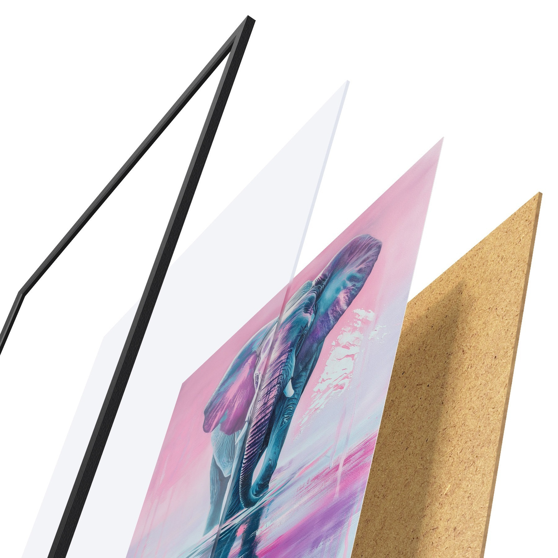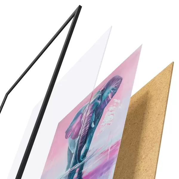 Plagát sa skladá z rámu, plexiskla, vytlačeného obrazu a podkladu z drevotriesky. Plagát možno okamžite zavesiť na stenu vďaka úchytom na zadnej strane.