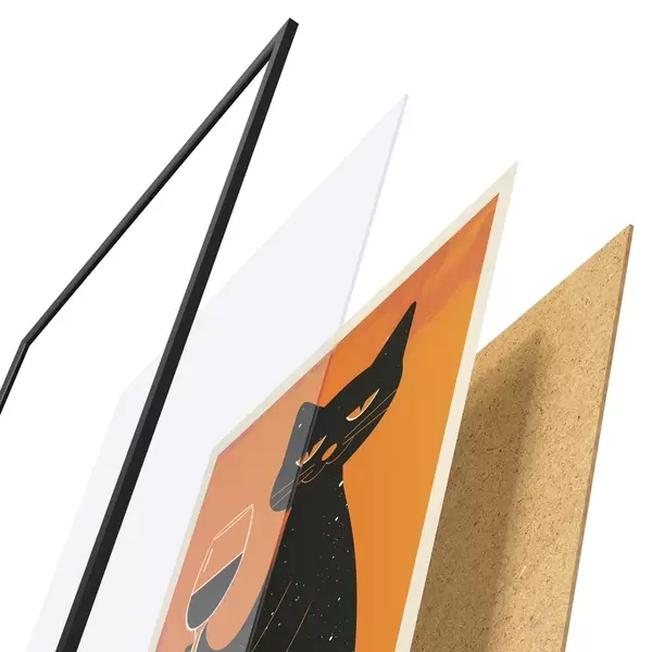 Plagát sa skladá z rámu, plexiskla, vytlačeného obrazu a podkladu z drevotriesky. Plagát možno okamžite zavesiť na stenu vďaka úchytom na zadnej strane.