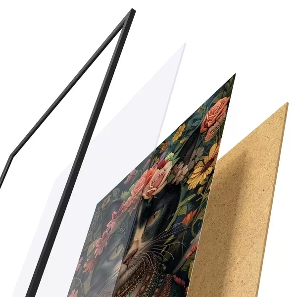 Plagát sa skladá z rámu, plexiskla, vytlačeného obrazu a podkladu z drevotriesky. Plagát možno okamžite zavesiť na stenu vďaka úchytom na zadnej strane.