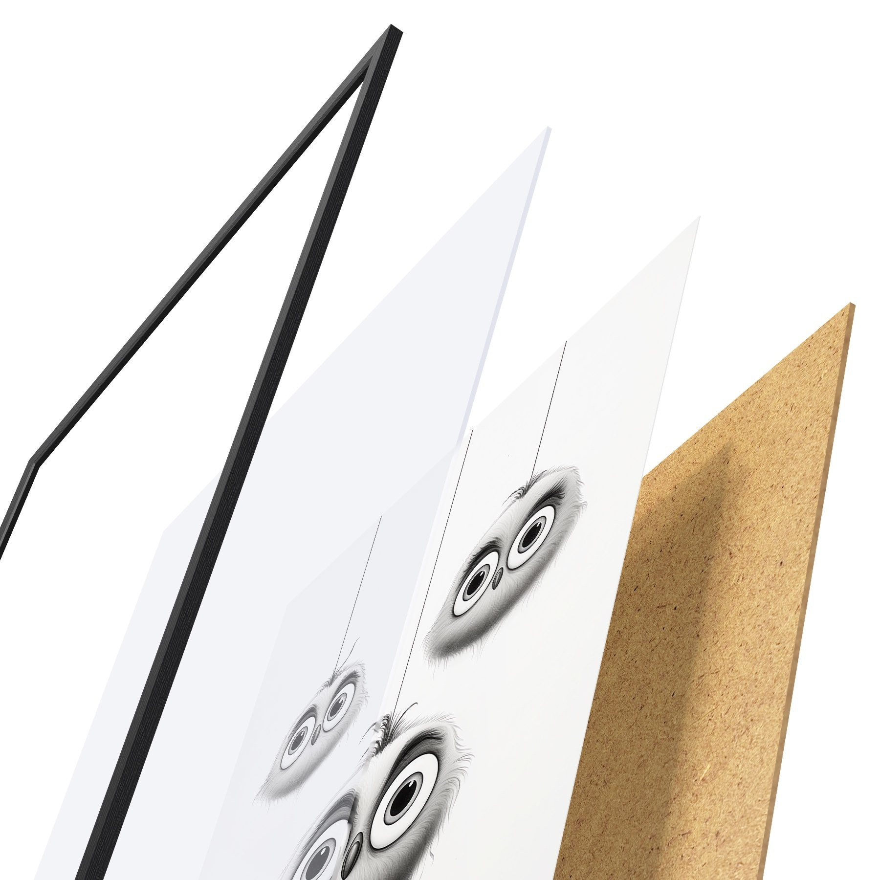Plagát sa skladá z rámu, plexiskla, vytlačeného obrazu a podkladu z drevotriesky. Plagát možno okamžite zavesiť na stenu vďaka úchytom na zadnej strane.