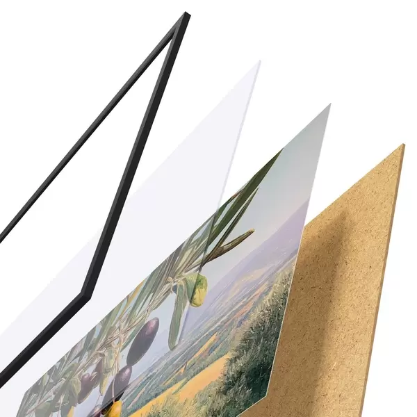 Plagát sa skladá z rámu, plexiskla, vytlačeného obrazu a podkladu z drevotriesky. Plagát možno okamžite zavesiť na stenu vďaka úchytom na zadnej strane.
