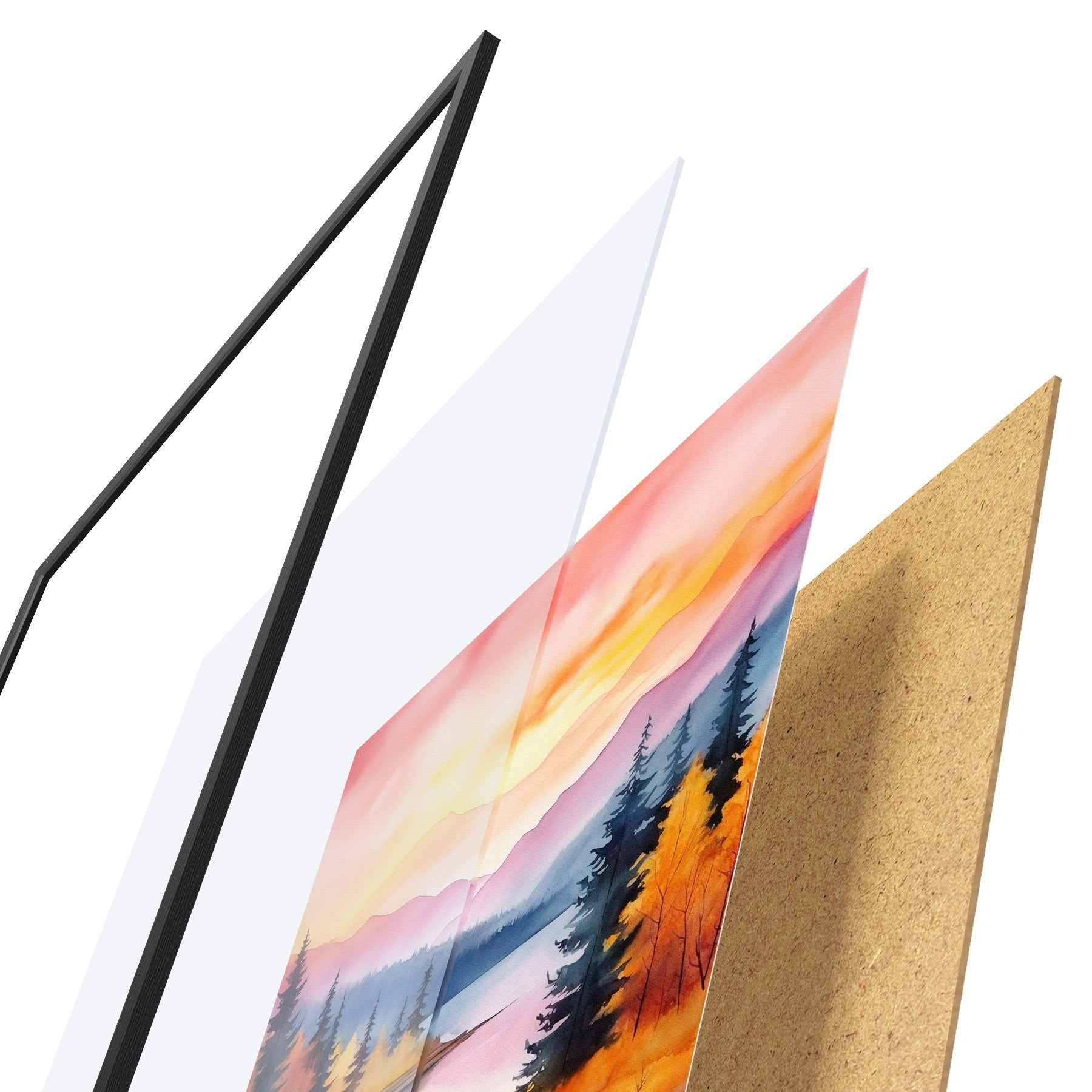 Plagát sa skladá z rámu, plexiskla, vytlačeného obrazu a podkladu z drevotriesky. Plagát možno okamžite zavesiť na stenu vďaka úchytom na zadnej strane.