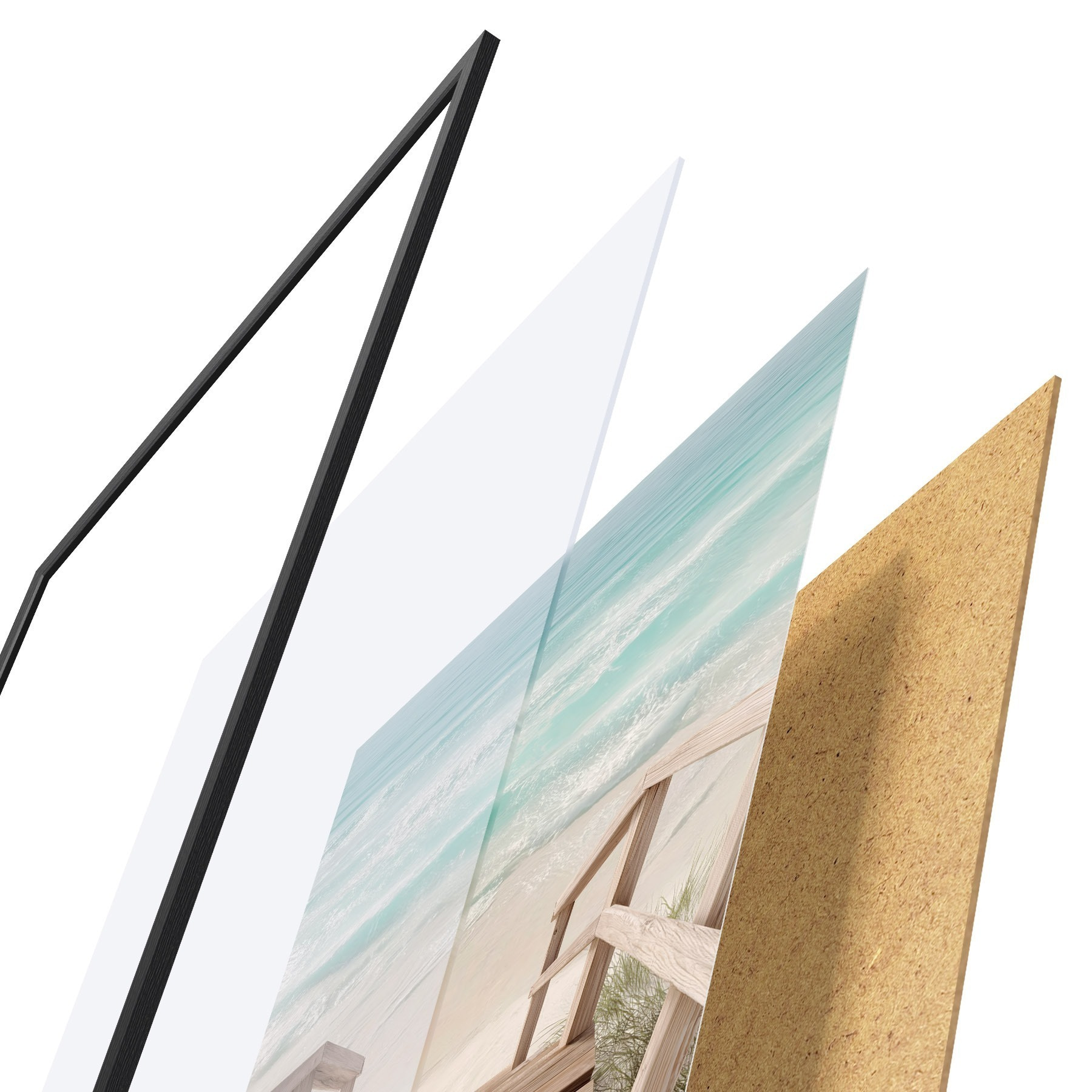 Plagát sa skladá z rámu, plexiskla, vytlačeného obrazu a podkladu z drevotriesky. Plagát možno okamžite zavesiť na stenu vďaka úchytom na zadnej strane.