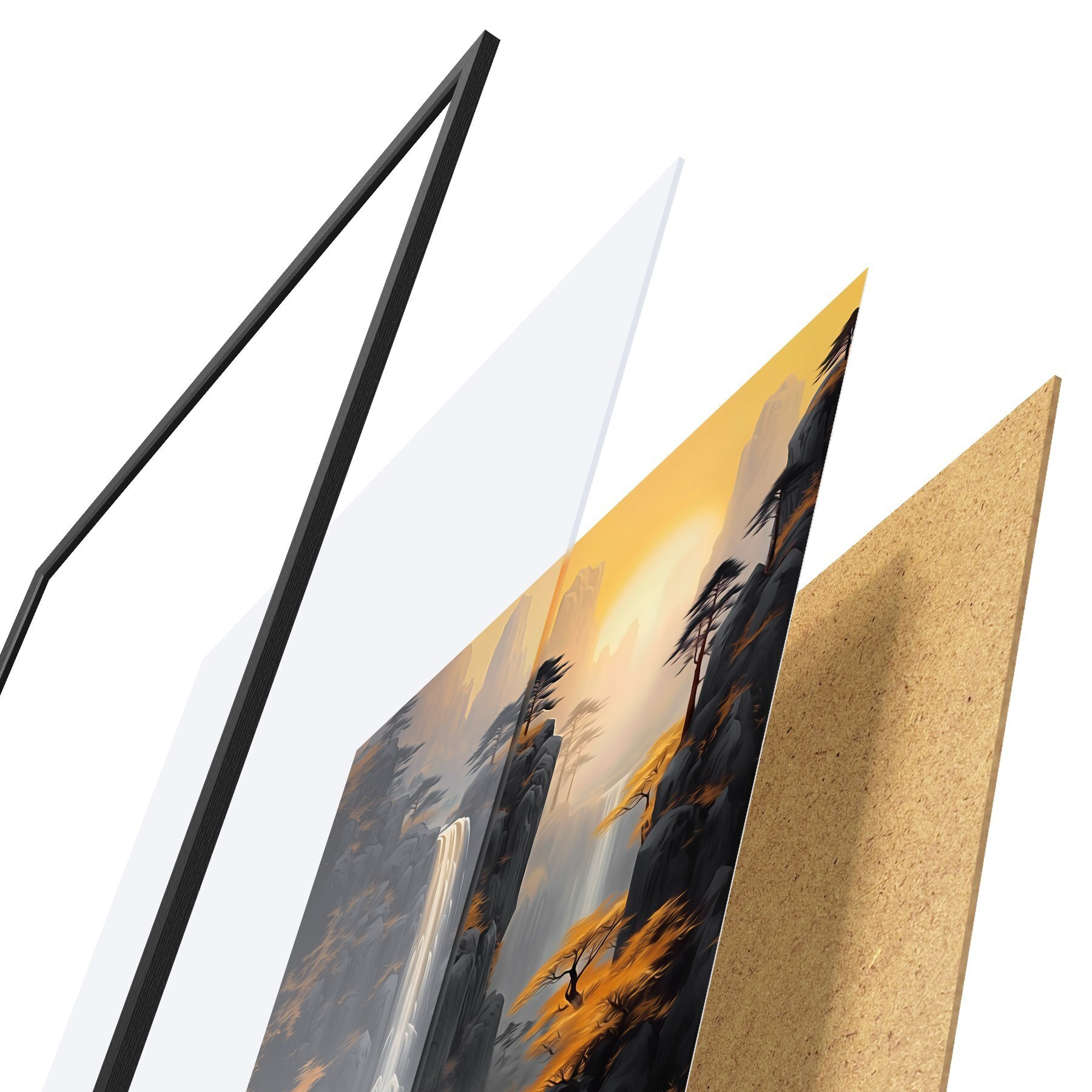 Plagát sa skladá z rámu, plexiskla, vytlačeného obrazu a podkladu z drevotriesky. Plagát možno okamžite zavesiť na stenu vďaka úchytom na zadnej strane.