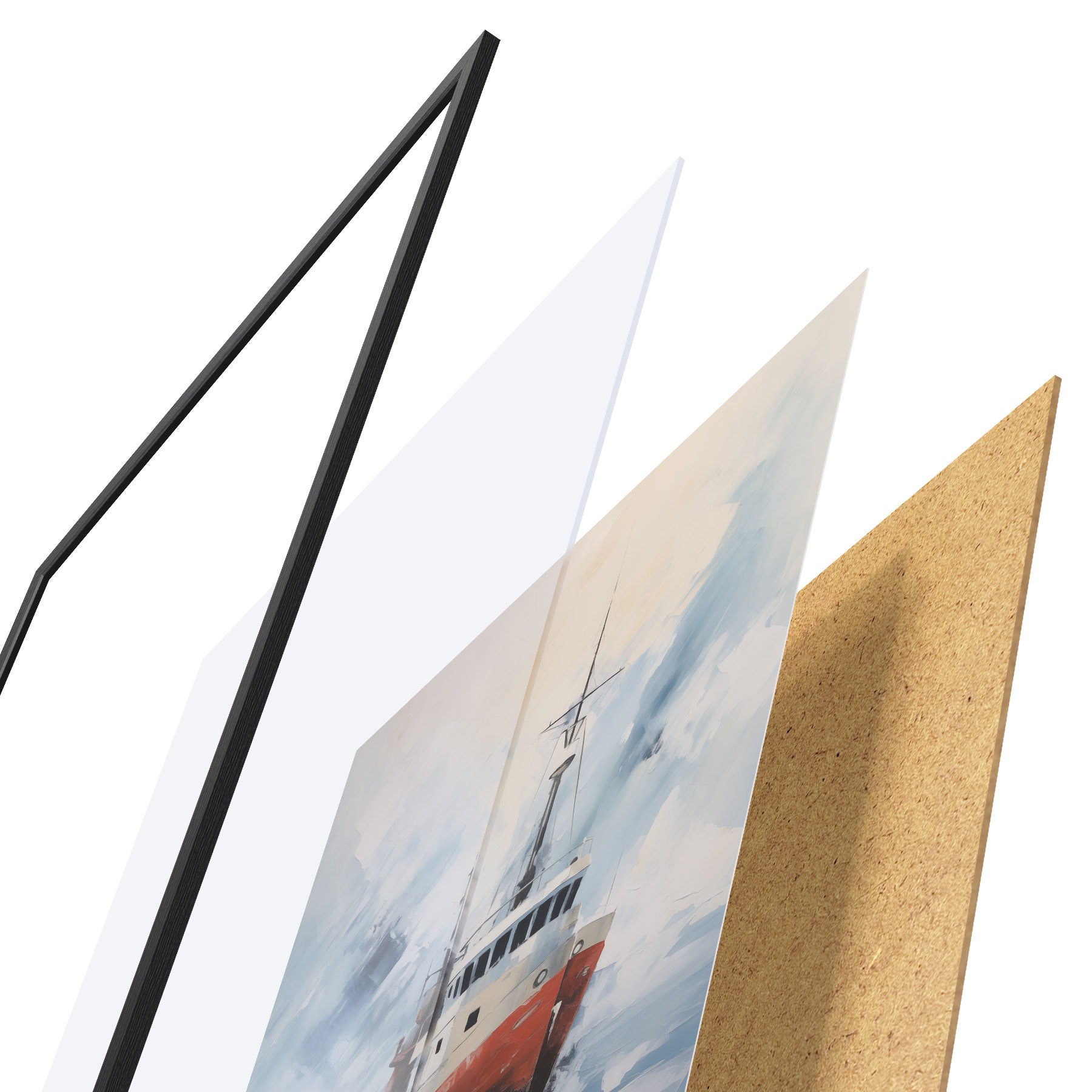 Plagát sa skladá z rámu, plexiskla, vytlačeného obrazu a podkladu z drevotriesky. Plagát možno okamžite zavesiť na stenu vďaka úchytom na zadnej strane.
