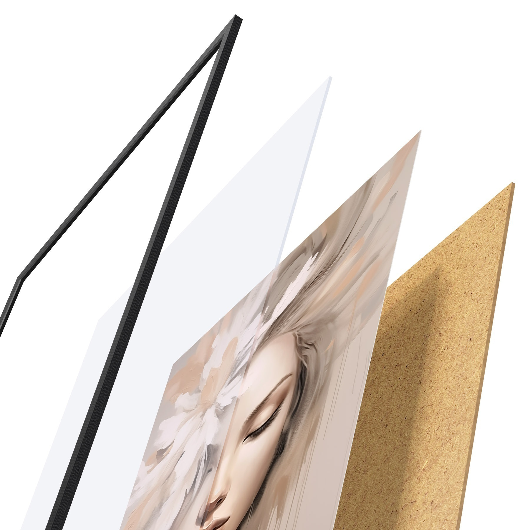Plagát sa skladá z rámu, plexiskla, vytlačeného obrazu a podkladu z drevotriesky. Plagát možno okamžite zavesiť na stenu vďaka úchytom na zadnej strane.
