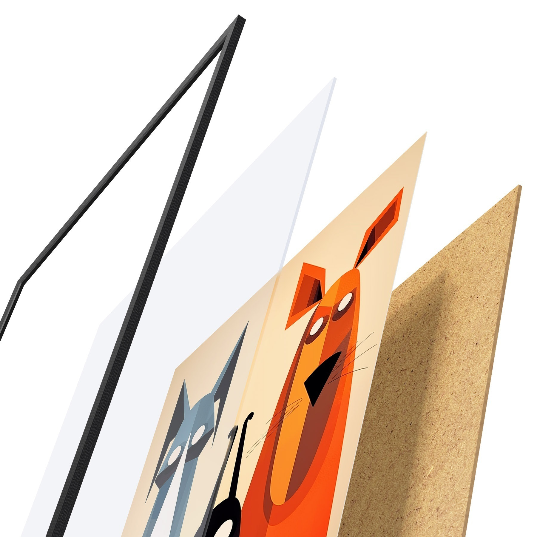 Plagát sa skladá z rámu, plexiskla, vytlačeného obrazu a podkladu z drevotriesky. Plagát možno okamžite zavesiť na stenu vďaka úchytom na zadnej strane.
