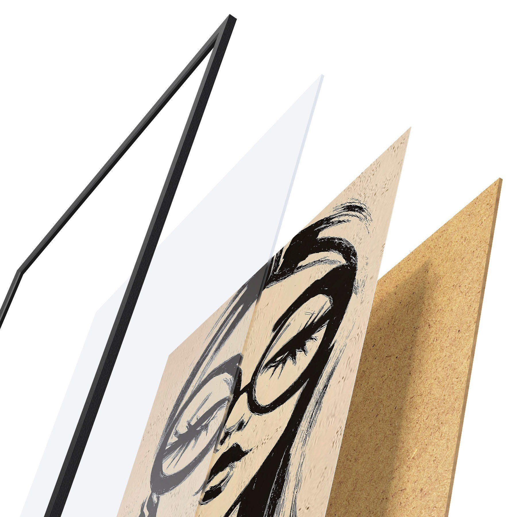 Plagát sa skladá z rámu, plexiskla, vytlačeného obrazu a podkladu z drevotriesky. Plagát možno okamžite zavesiť na stenu vďaka úchytom na zadnej strane.