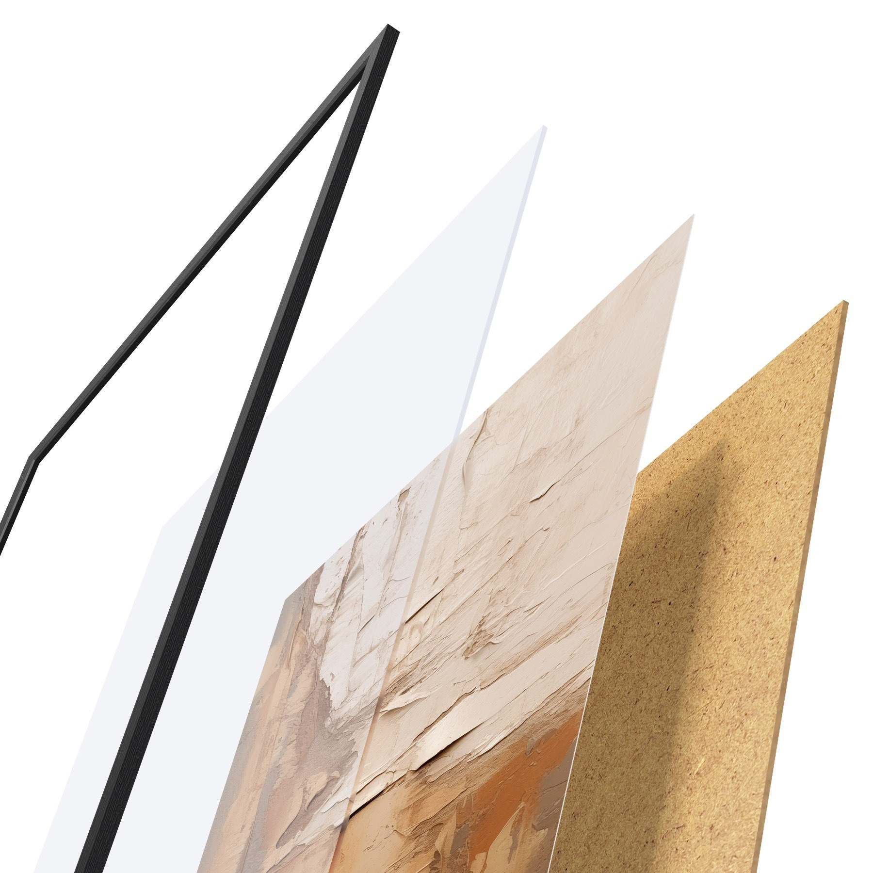 Plagát sa skladá z rámu, plexiskla, vytlačeného obrazu a podkladu z drevotriesky. Plagát možno okamžite zavesiť na stenu vďaka úchytom na zadnej strane.