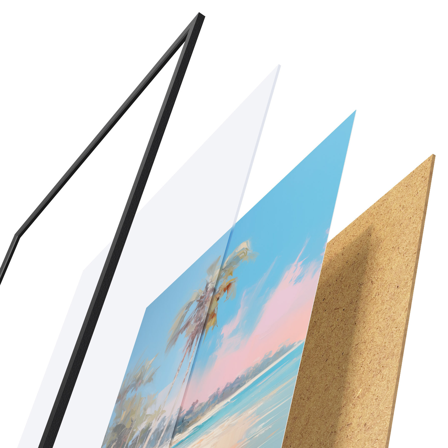 Plagát sa skladá z rámu, plexiskla, vytlačeného obrazu a podkladu z drevotriesky. Plagát možno okamžite zavesiť na stenu vďaka úchytom na zadnej strane.