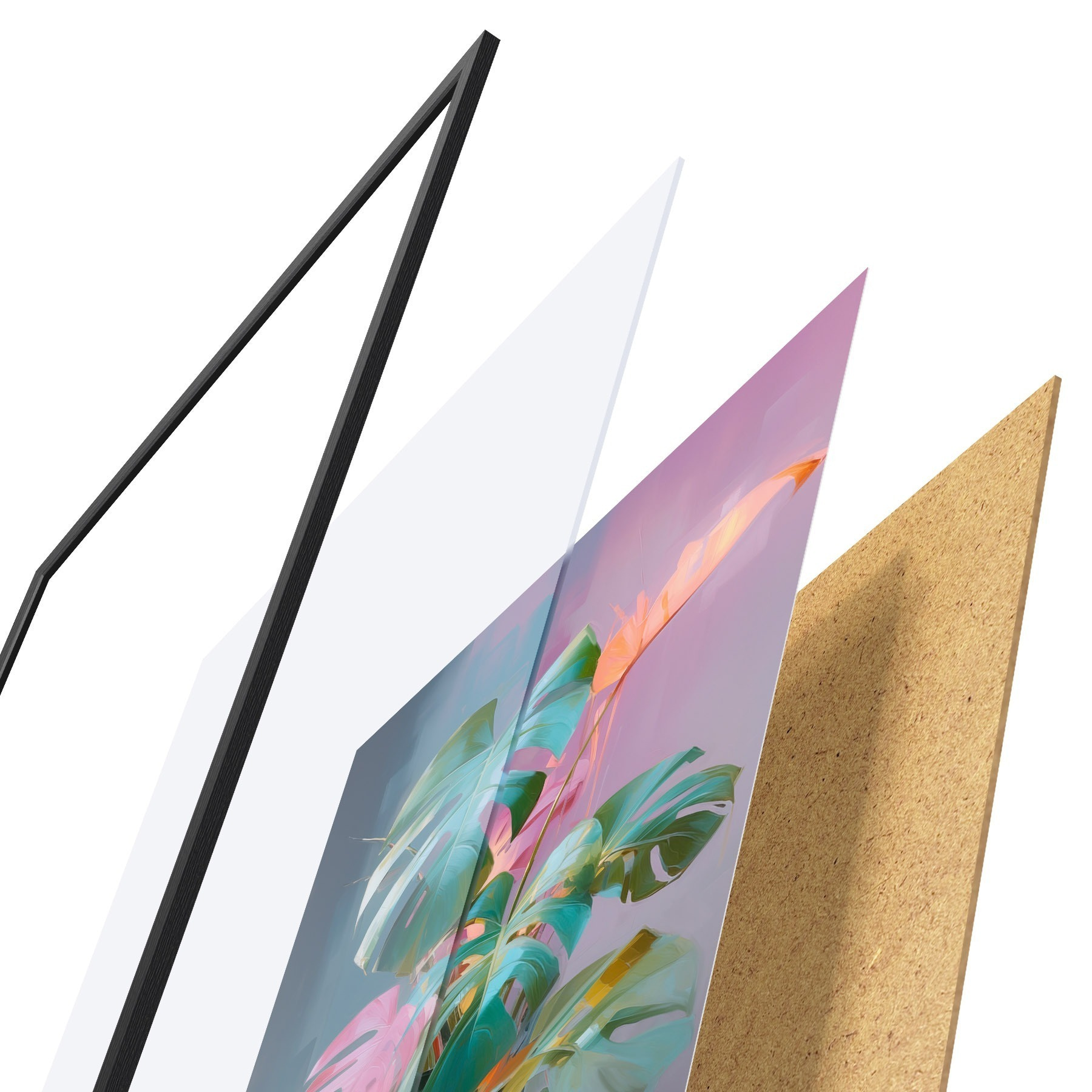 Plagát sa skladá z rámu, plexiskla, vytlačeného obrazu a podkladu z drevotriesky. Plagát možno okamžite zavesiť na stenu vďaka úchytom na zadnej strane.