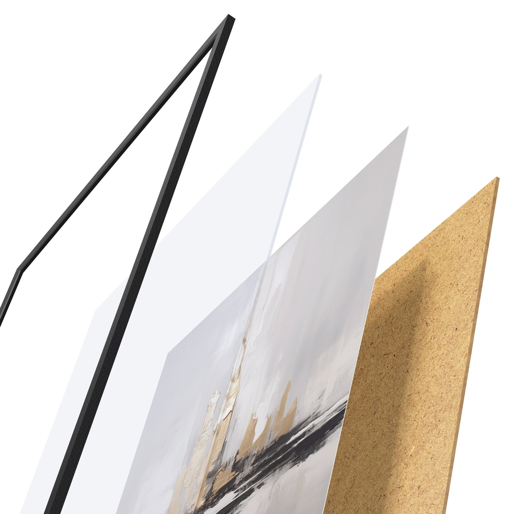 Plagát sa skladá z rámu, plexiskla, vytlačeného obrazu a podkladu z drevotriesky. Plagát možno okamžite zavesiť na stenu vďaka úchytom na zadnej strane.