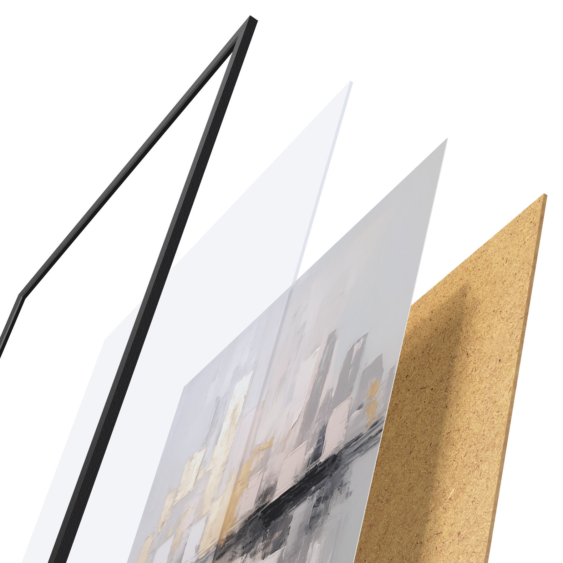 Plagát sa skladá z rámu, plexiskla, vytlačeného obrazu a podkladu z drevotriesky. Plagát možno okamžite zavesiť na stenu vďaka úchytom na zadnej strane.