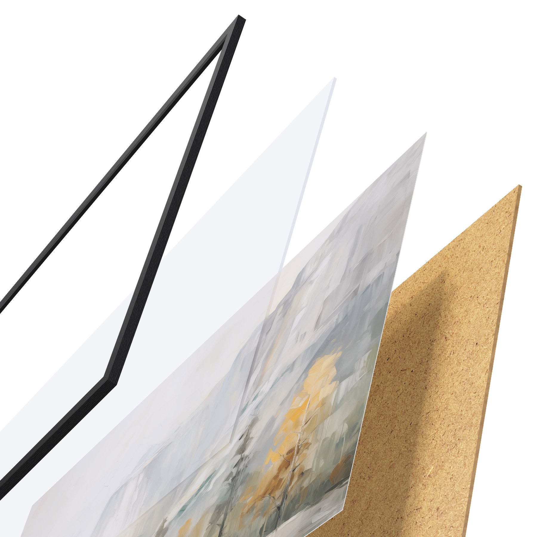 Plagát sa skladá z rámu, plexiskla, vytlačeného obrazu a podkladu z drevotriesky. Plagát možno okamžite zavesiť na stenu vďaka úchytom na zadnej strane.