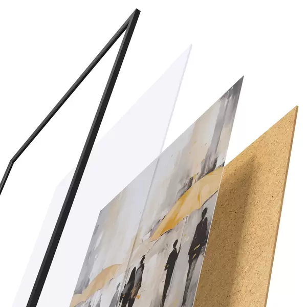 Plagát sa skladá z rámu, plexiskla, vytlačeného obrazu a podkladu z drevotriesky. Plagát možno okamžite zavesiť na stenu vďaka úchytom na zadnej strane.