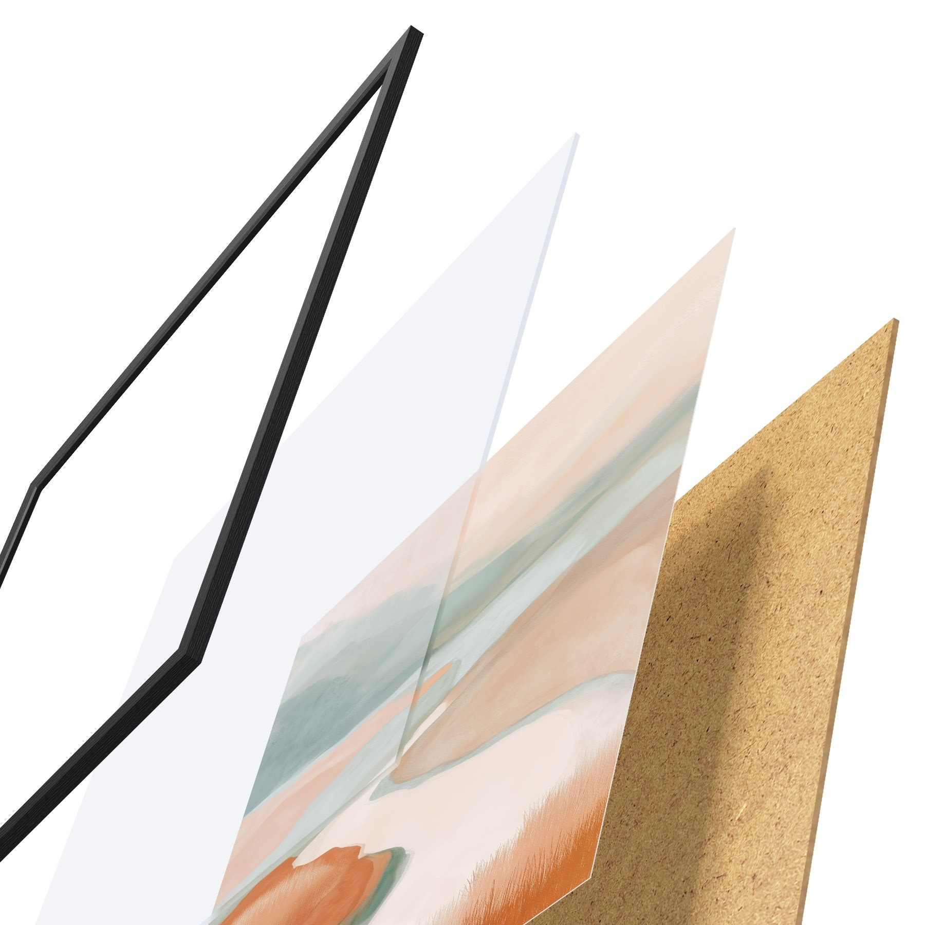 Plagát sa skladá z rámu, plexiskla, vytlačeného obrazu a podkladu z drevotriesky. Plagát možno okamžite zavesiť na stenu vďaka úchytom na zadnej strane.
