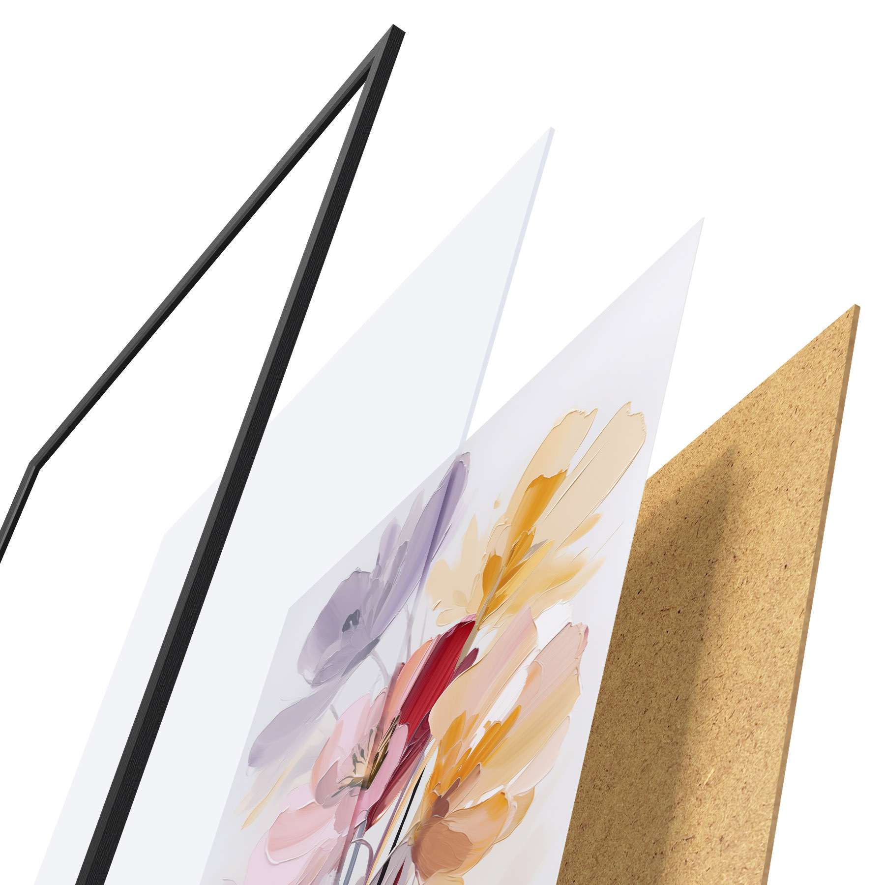 Plagát sa skladá z rámu, plexiskla, vytlačeného obrazu a podkladu z drevotriesky. Plagát možno okamžite zavesiť na stenu vďaka úchytom na zadnej strane.